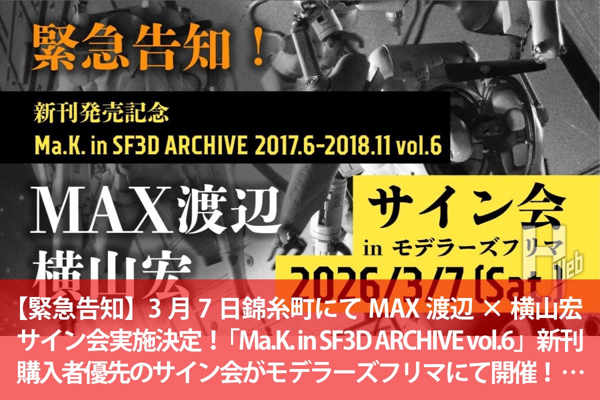 2026.03.04 【緊急告知】3月7日錦糸町にてMAX渡辺×横山宏サイン会実施決定! 「Ma.K. in SF3D ARCHIVE vol.6」新刊購入者優先のサイン会がモデラーズフリマにて開催! 収録の裏側動画も配信開始!