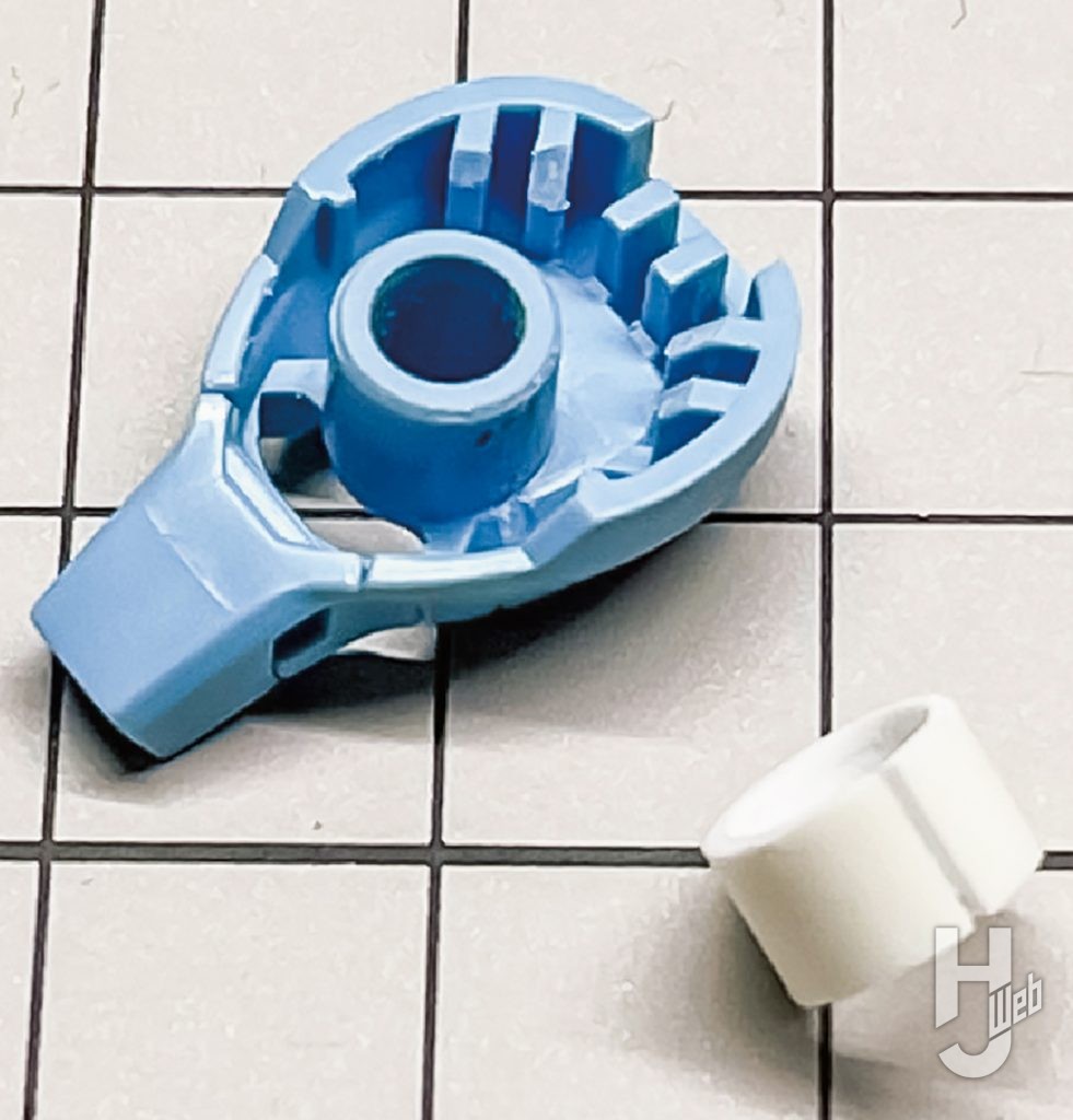 ▲生産性を考えると前腕部品は左右共通であるべきと考え、左腕にスジ彫りでヒート・ロッドの基部を表現してみた