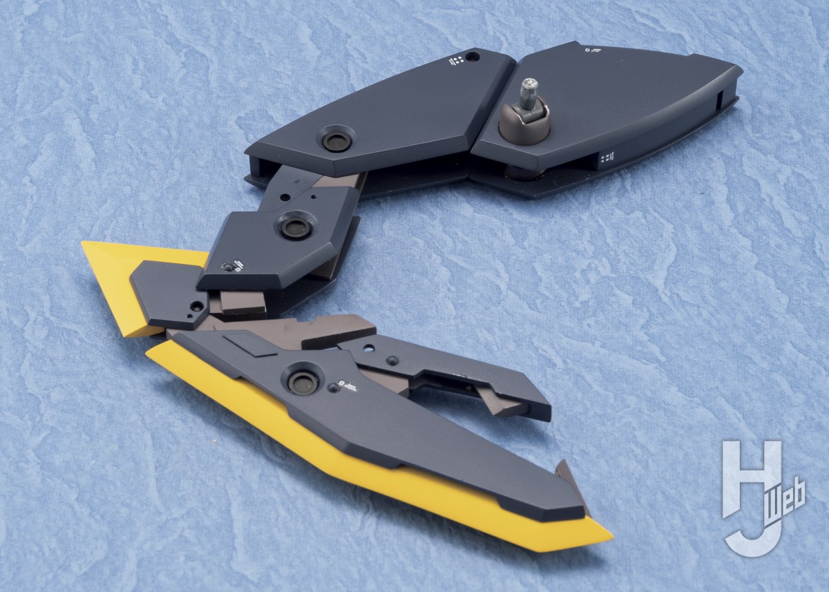 ▲ シールドプライヤーユニットは根元、アームで3ヵ所、クローで2ヵ所可動。収納状態の各パーツがピッタリ噛み合った様をご確認いただきたい