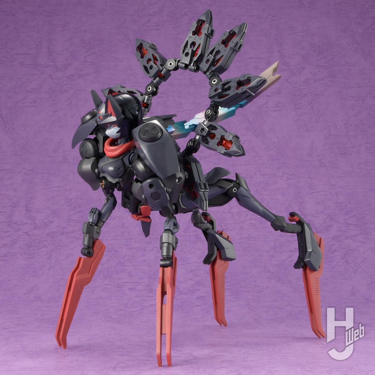ヘキサギアには隠密部隊のナイトストーカーズという設定があります。風魔のシノビっぽさとも合うと思い、黒と赤のナイトストーカーズ配色にしてみました。塗料には公式塗料のヘキサブラックとヘキサレッドを使用しています。