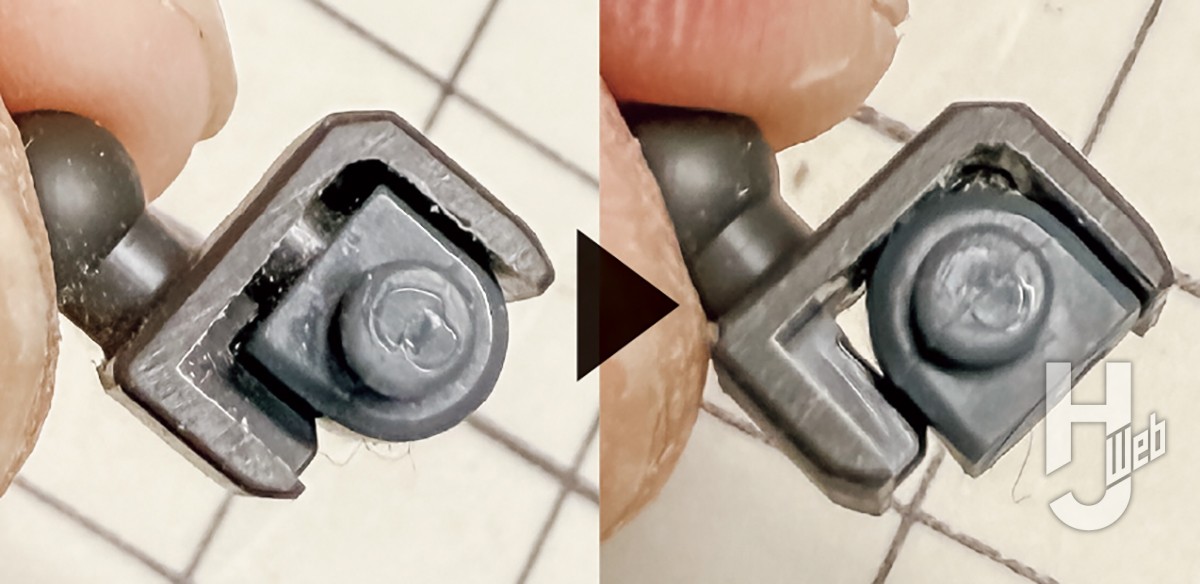 肩は胴体に接続するボールジョイントパーツのポリキャップを説明書とは逆に差し込み、より胴体と密着できるように加工。