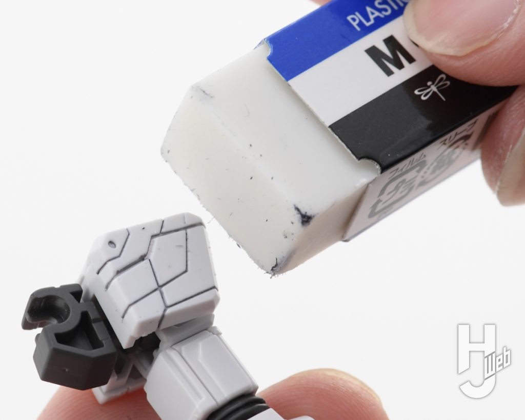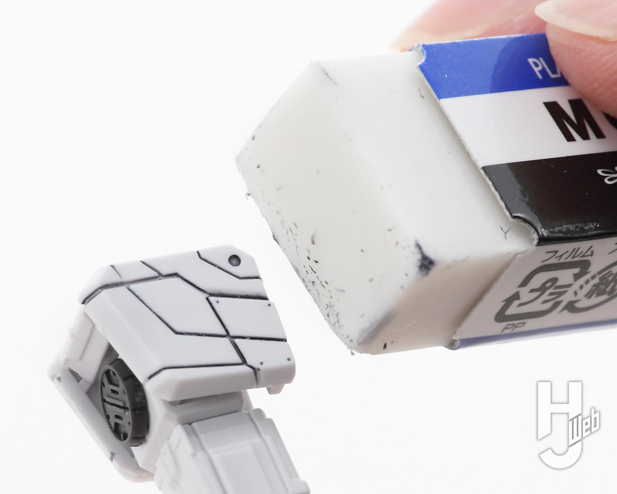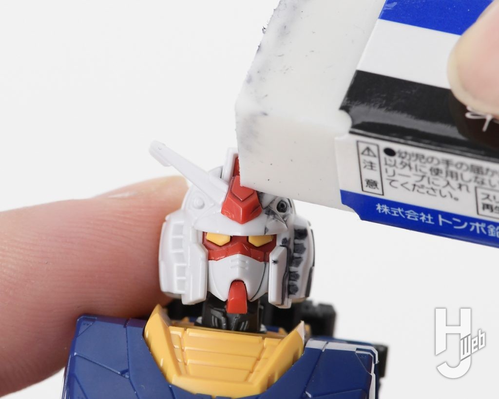 ▲ハミ出しの拭き取りはこちらも同様に。消しゴムはフチを使ってパーツ面をしっかりこすることができます。狭い箇所などでは綿棒を使ったり、消しゴムを細く切って使うとよいでしょう