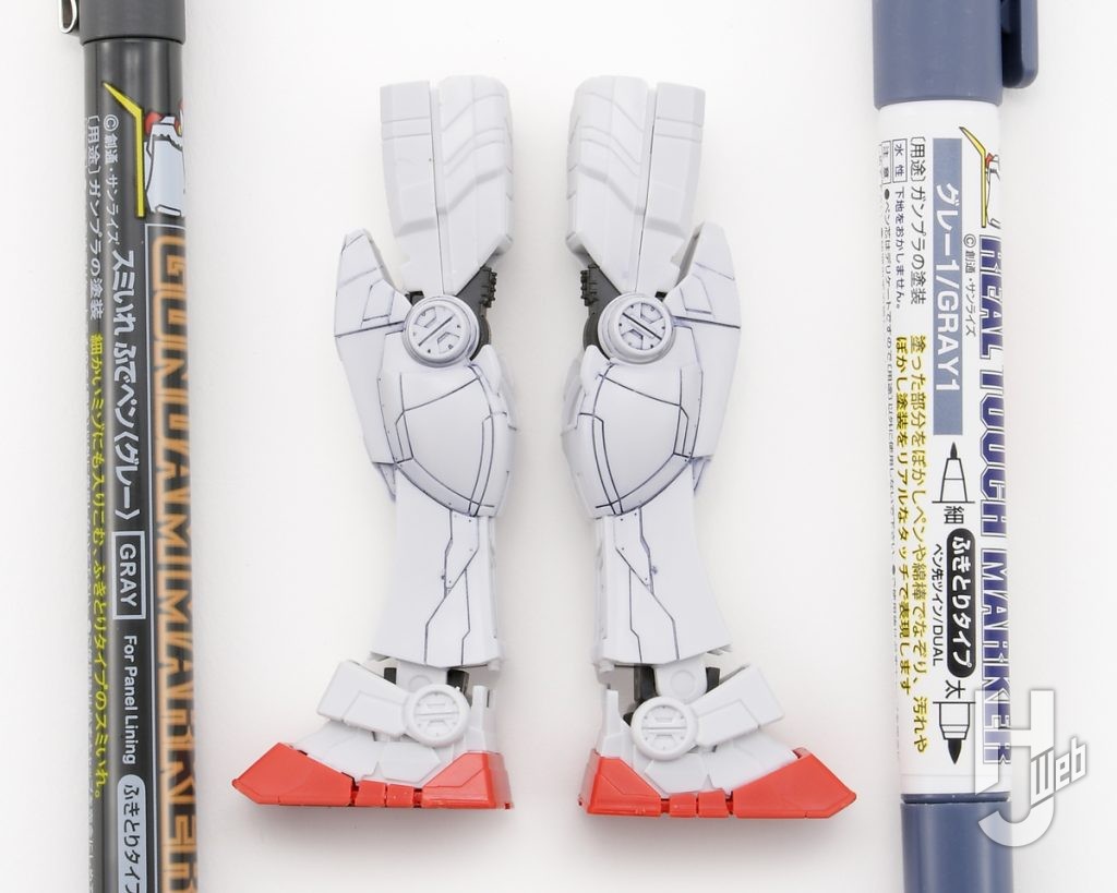 ▲ 使い勝手が似ているガンダムマーカー スミ入れふでぺんとガンダムマーカー リアルタッチマーカーでのスミ入れを比較。色の違いの他には、ほとんど仕上がりに違いはありません。合わせて使えば色数が豊富でパーツ色によって選びやすくなります