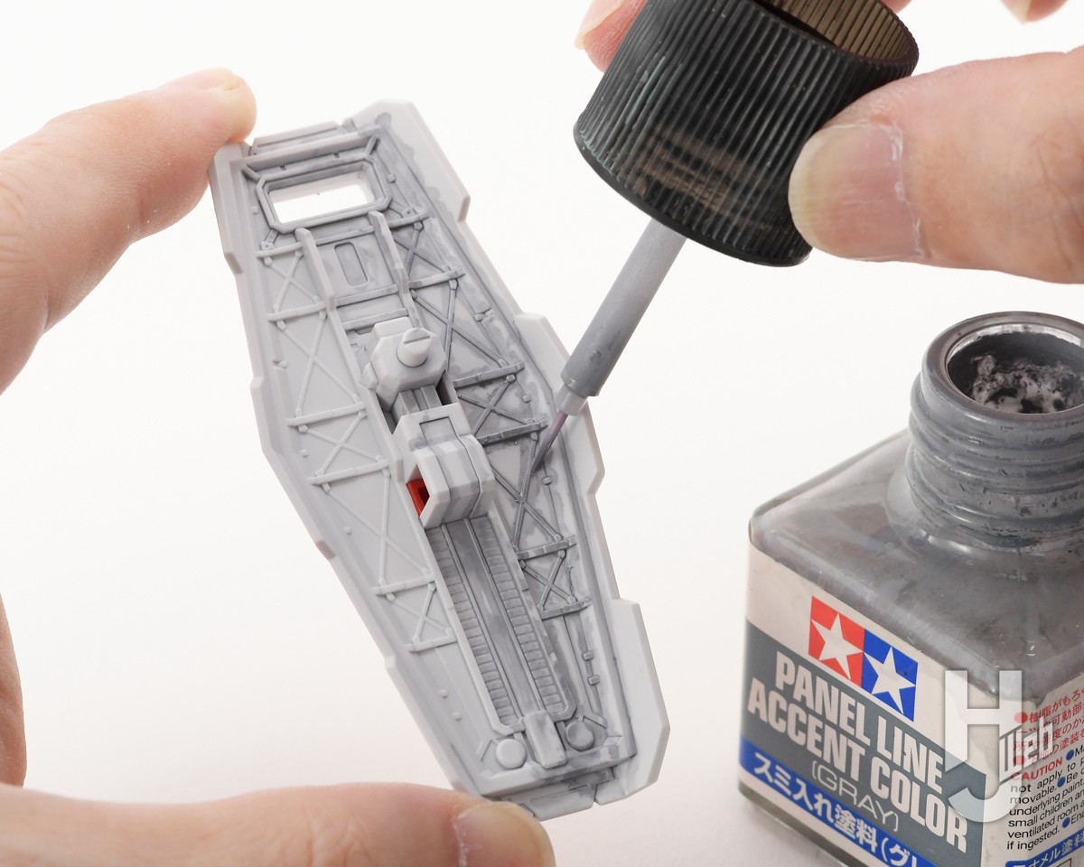 ▲ スミ入れしやすい濃さと色のエナメル系塗料です。凹みに沿って流れやすいので、モールド全体を一気に塗ってスミ入れしていくことができます。フタの裏についた細いブラシで塗っていきます