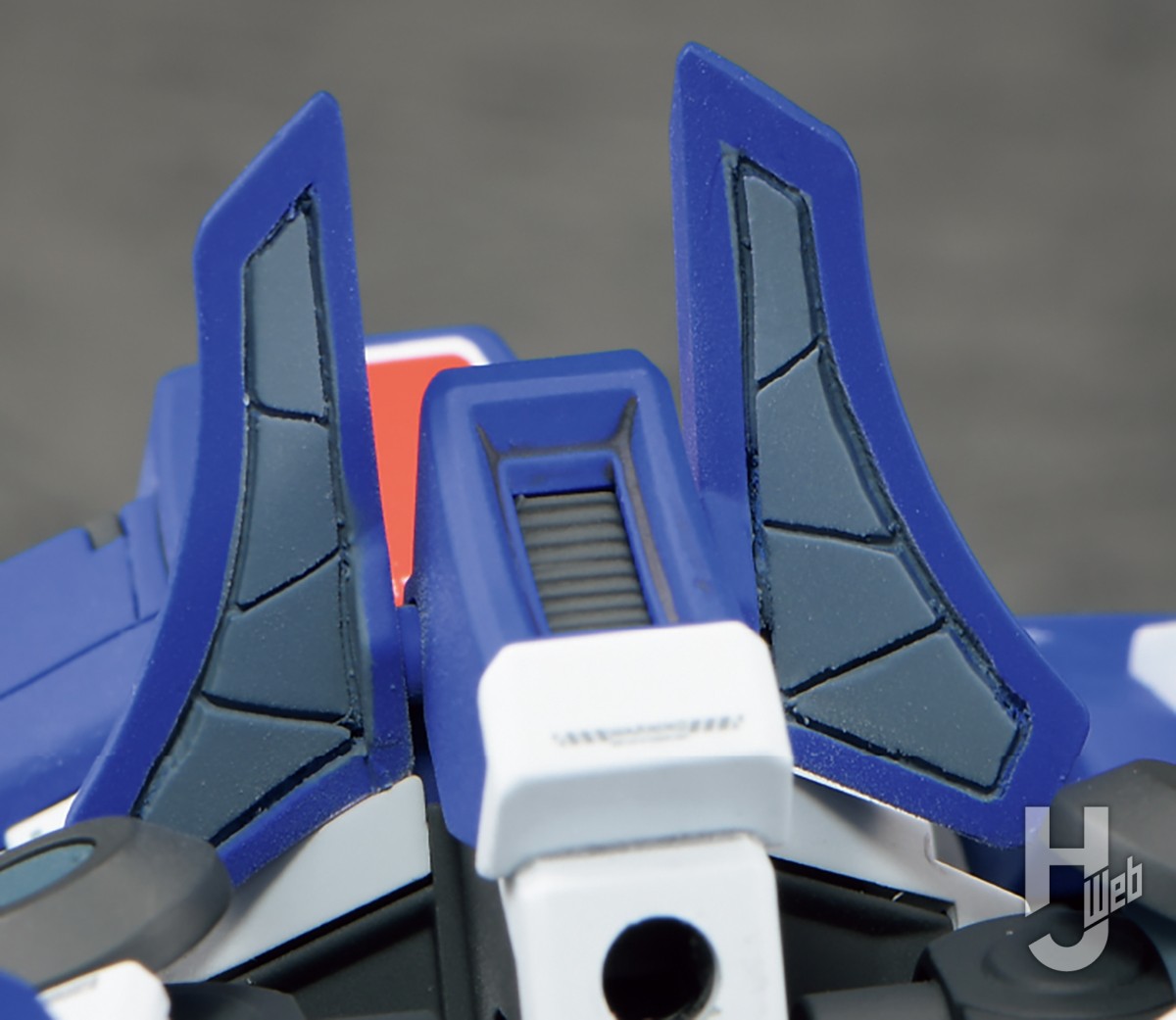 白いアンテナの付け根、四角いブロックのところがちょっと大きいかなと思ったので、真ん中で前後に切断してから約0.8mm削って縮めました。アンテナ本体もヤスリがけして先端を尖らせています。また、中央の赤いトサカは裏側に肉抜き穴があるので、プラ板と瞬着で埋めました。