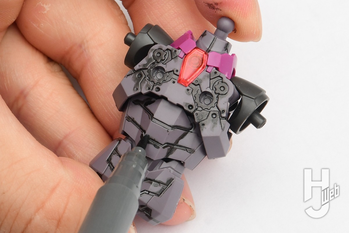 ▲ディテール部分にスミ入れが完了。成形色に沿った色合いなのも相まって、かなりメリハリがつきましたね