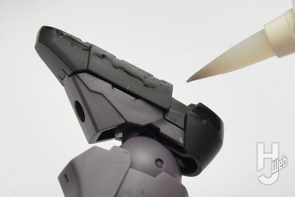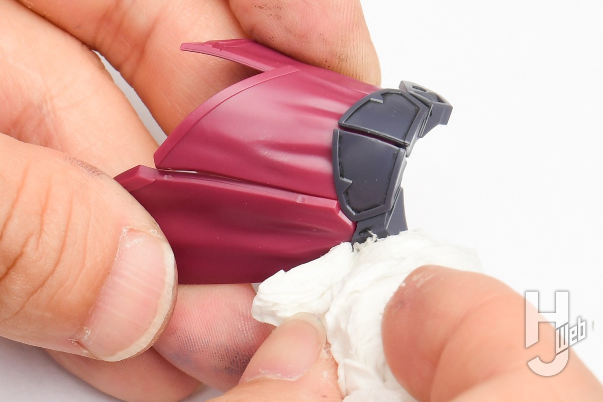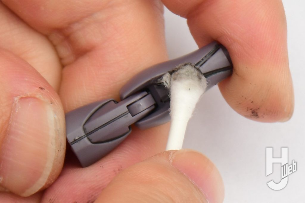 ▲ ブレンディングリキッドをつけた綿棒で表面のインクを拭き取っていきます。段差やディテール部分は強く拭わず、インクを残しましょう