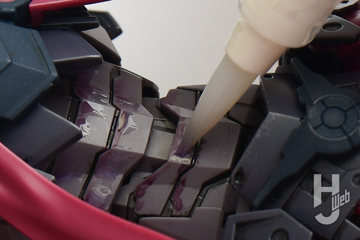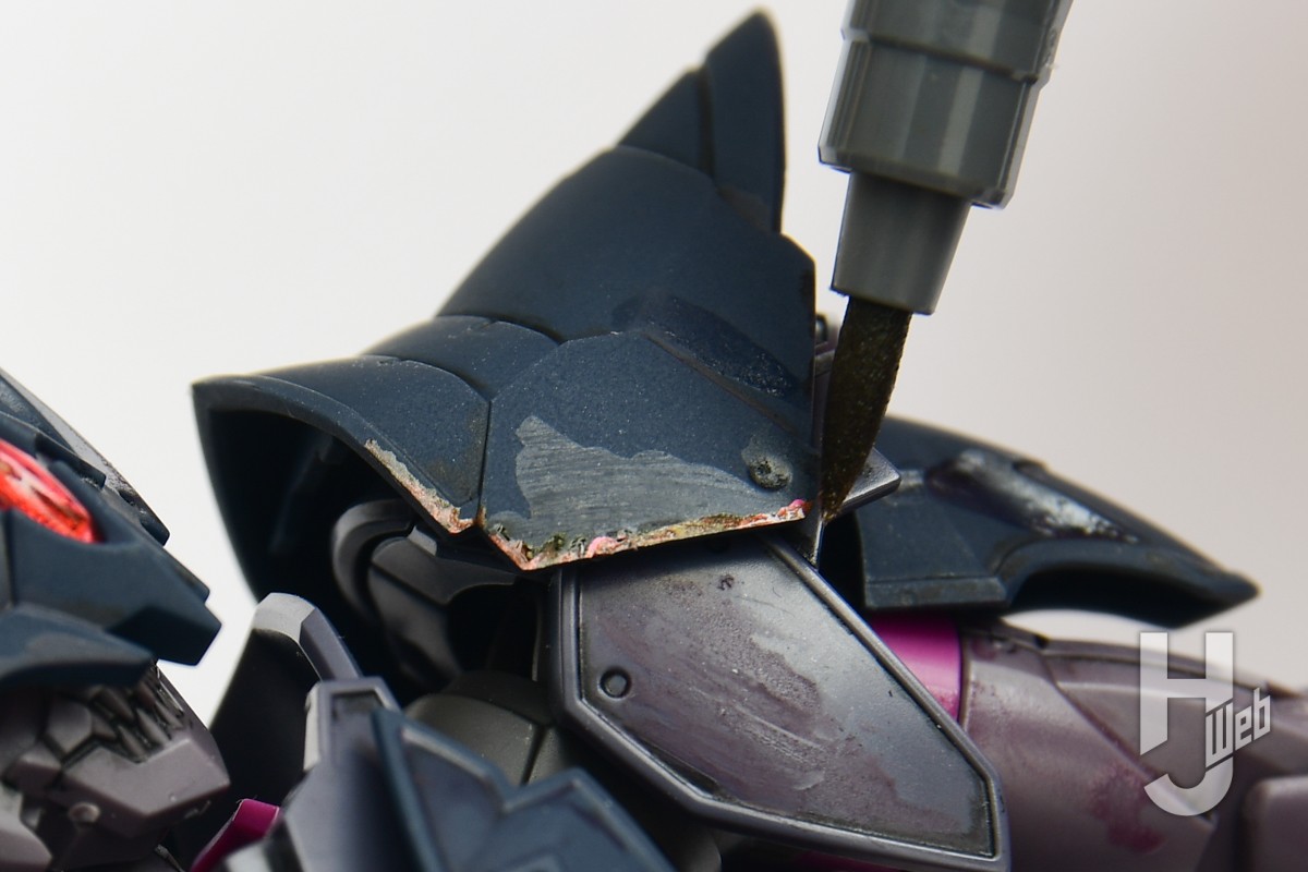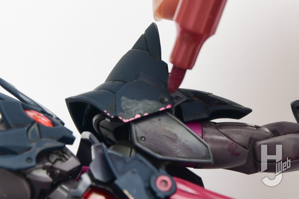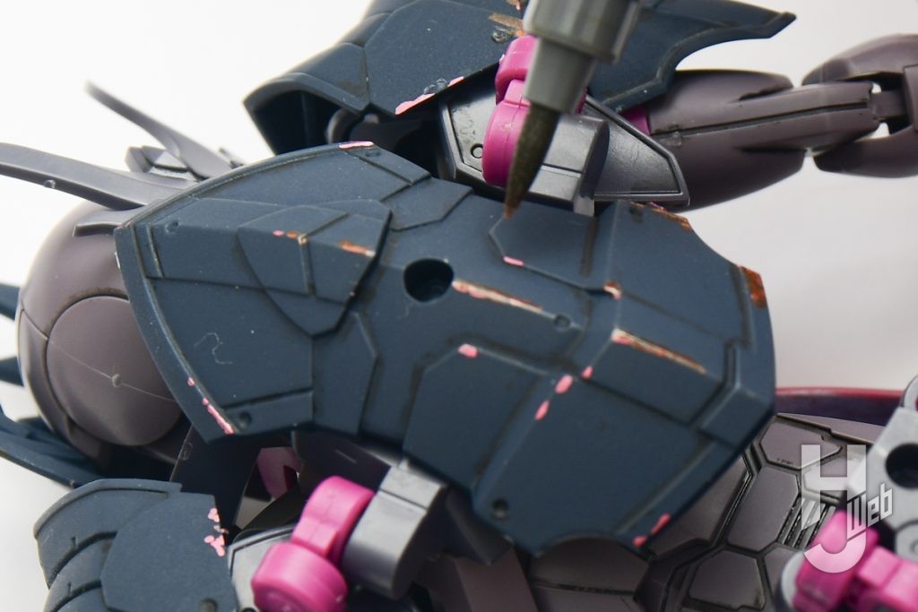 ▲背面のアーマーは擦れる場所がわかりやすいので、出っ張りをメタリックピンクで塗った後、同じ方法でウェザリング