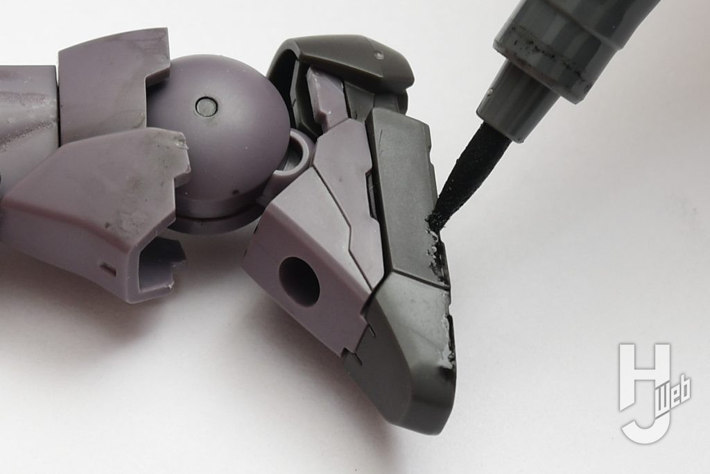 ▲ スミ入れ、汚れ、メタリックの塗装を施して、まるで歴戦を潜り抜けたかのような勇ましい30MFになりました。汚しを重ねていくことで、重厚感が出ていい味となります。ペンであれば塗布したい箇所を狙いやすいので、汚しも”描く”ように意識すると、キメ細やかで良い汚しが行えます