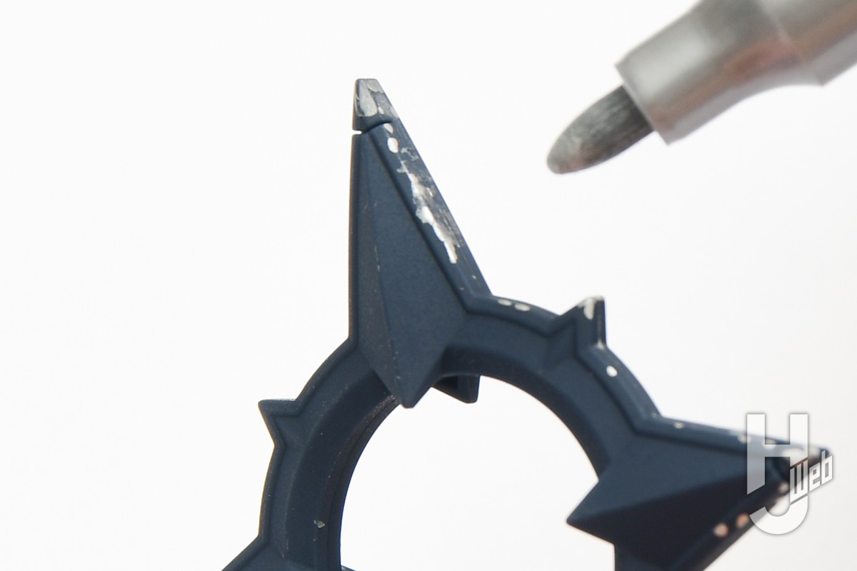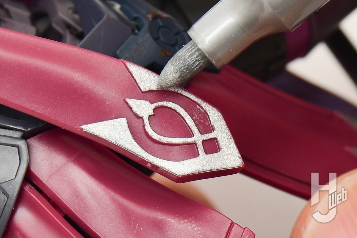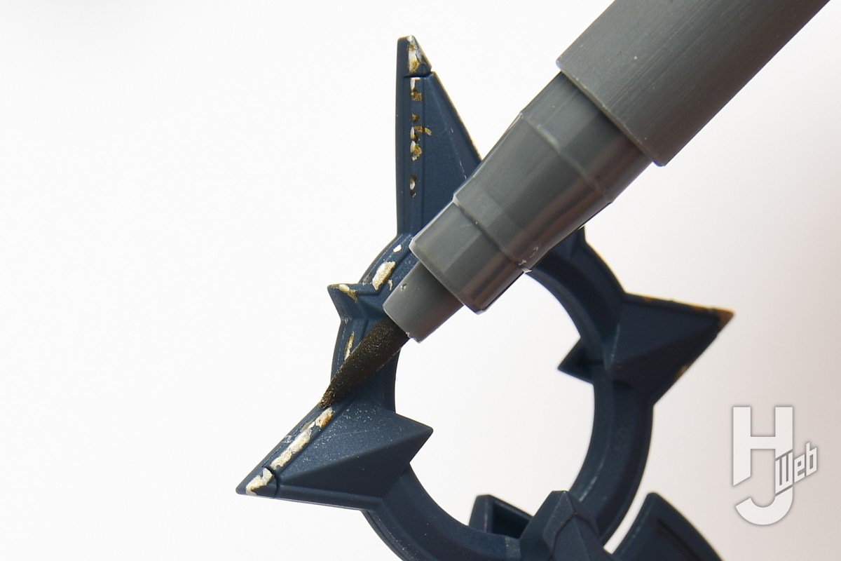 ▲そのままの色では明るすぎるので、メタリックマーカーペンセットに付属しているライナーを軽くつけます。そうすると、やや時間の経った落ち着いた銀色になり、ウェザリングを施すことができます