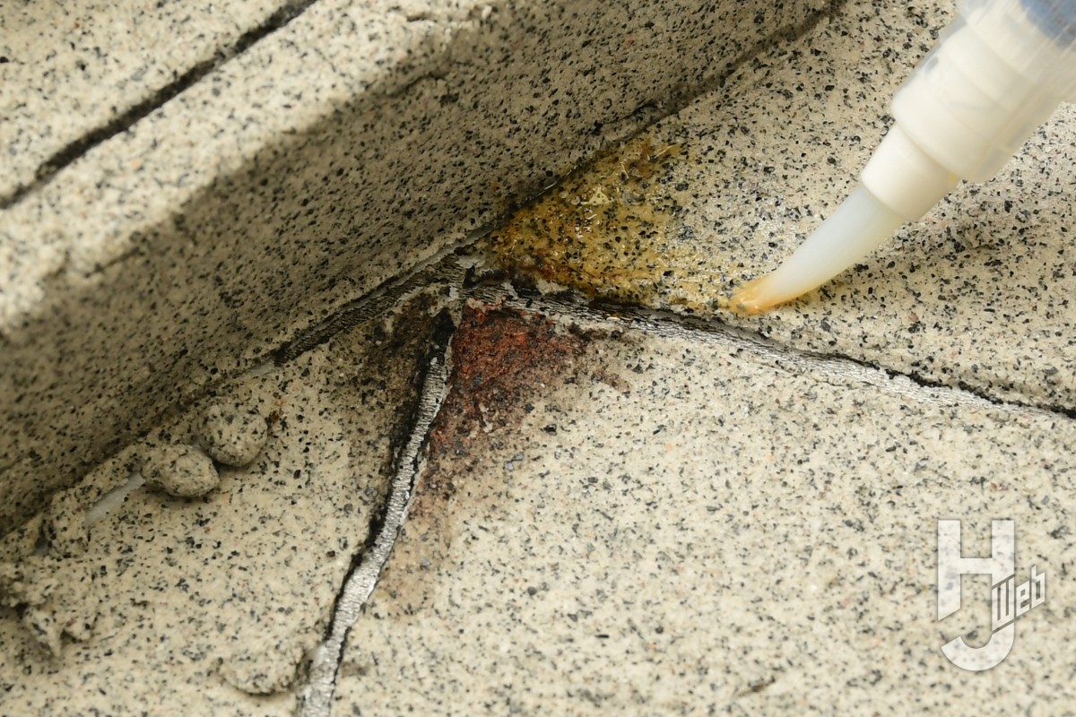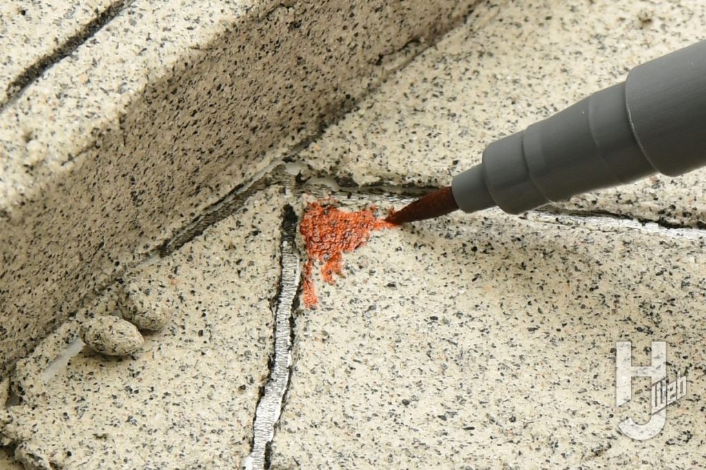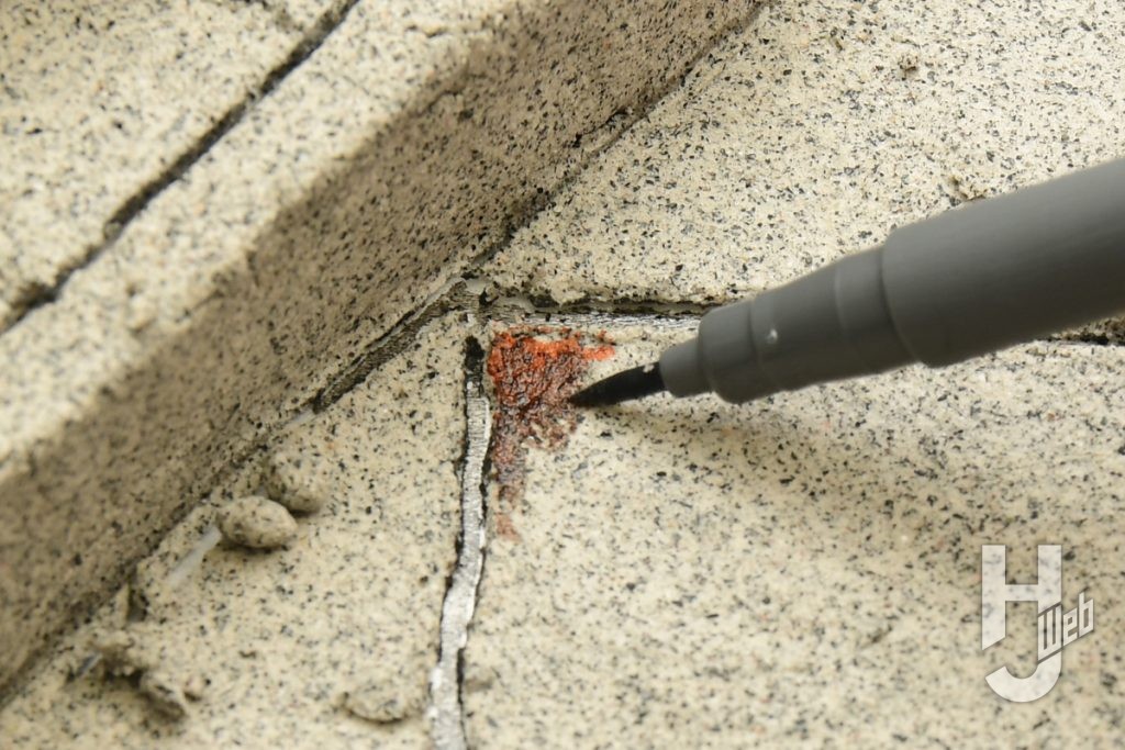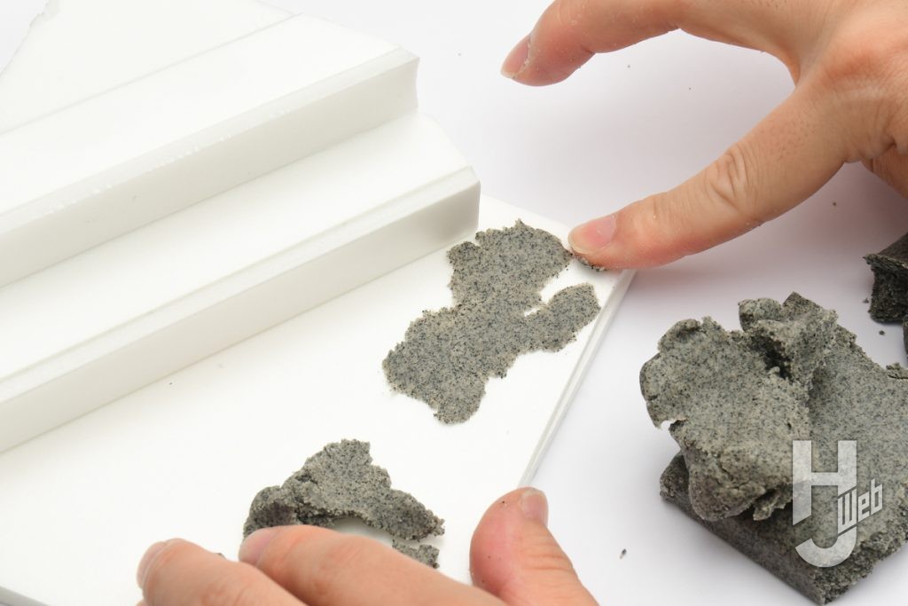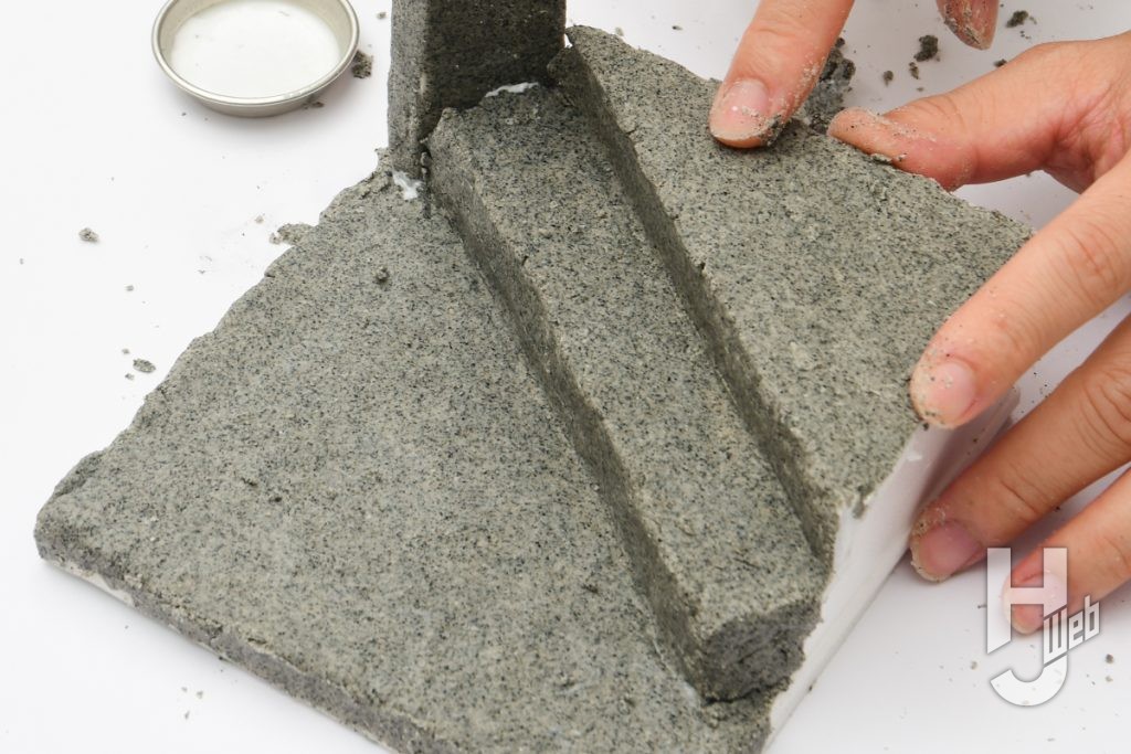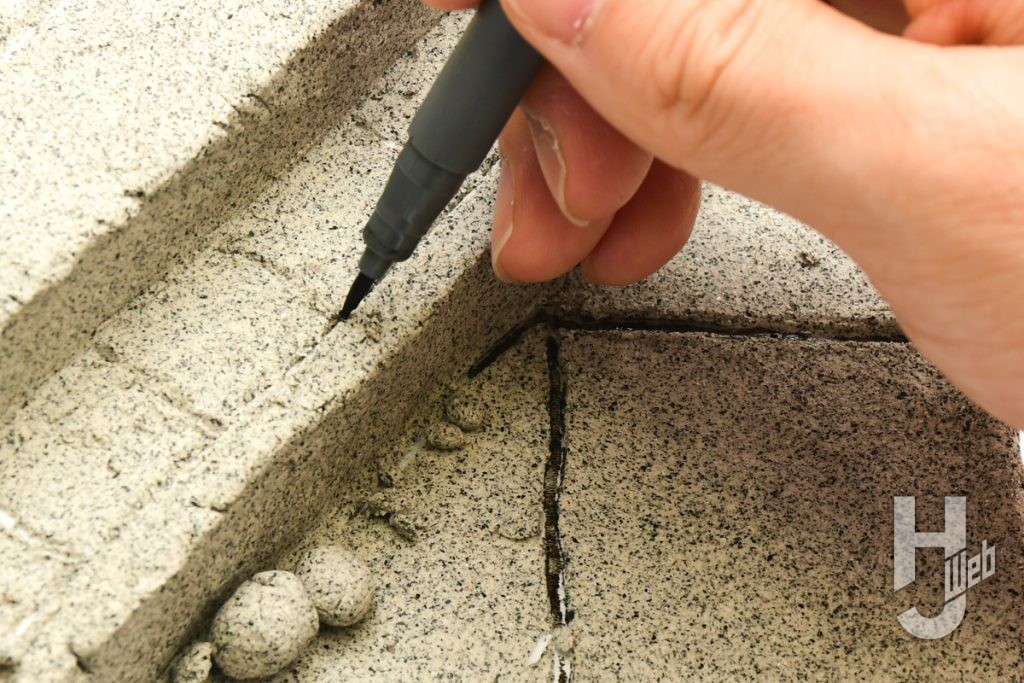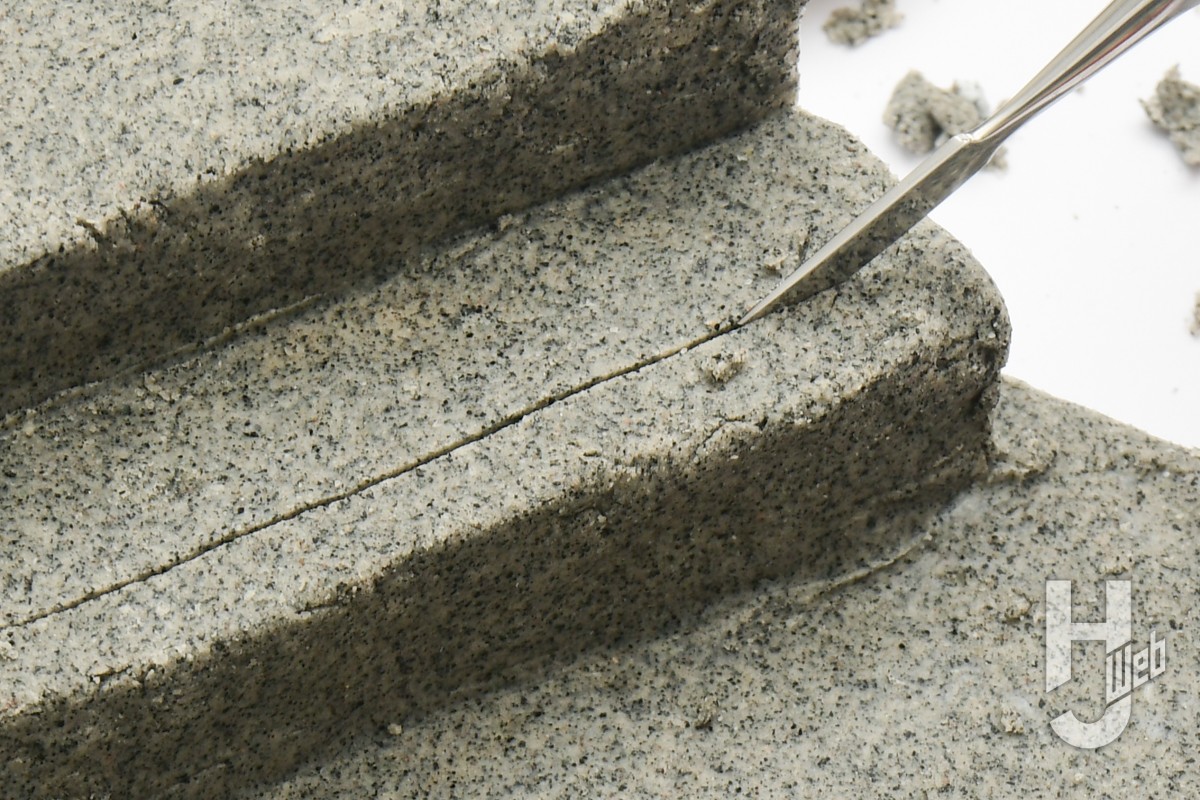 ▲ 乾燥をさせる前に、ちょっとだけディテールを入れます。石を組み合わせたようなイメージにして、スパチュラで溝を作っていきます