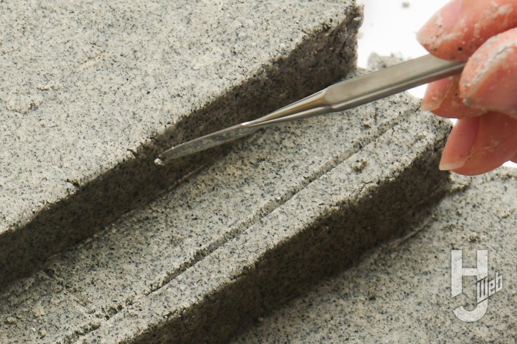 ▲ 縦列にも刻んでいきます。単にスジをつけるだけでなく、ちょっとスジを開いてランダム感をつけ、より石の組み合わせっぽくなるように意識しました