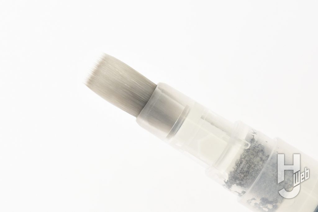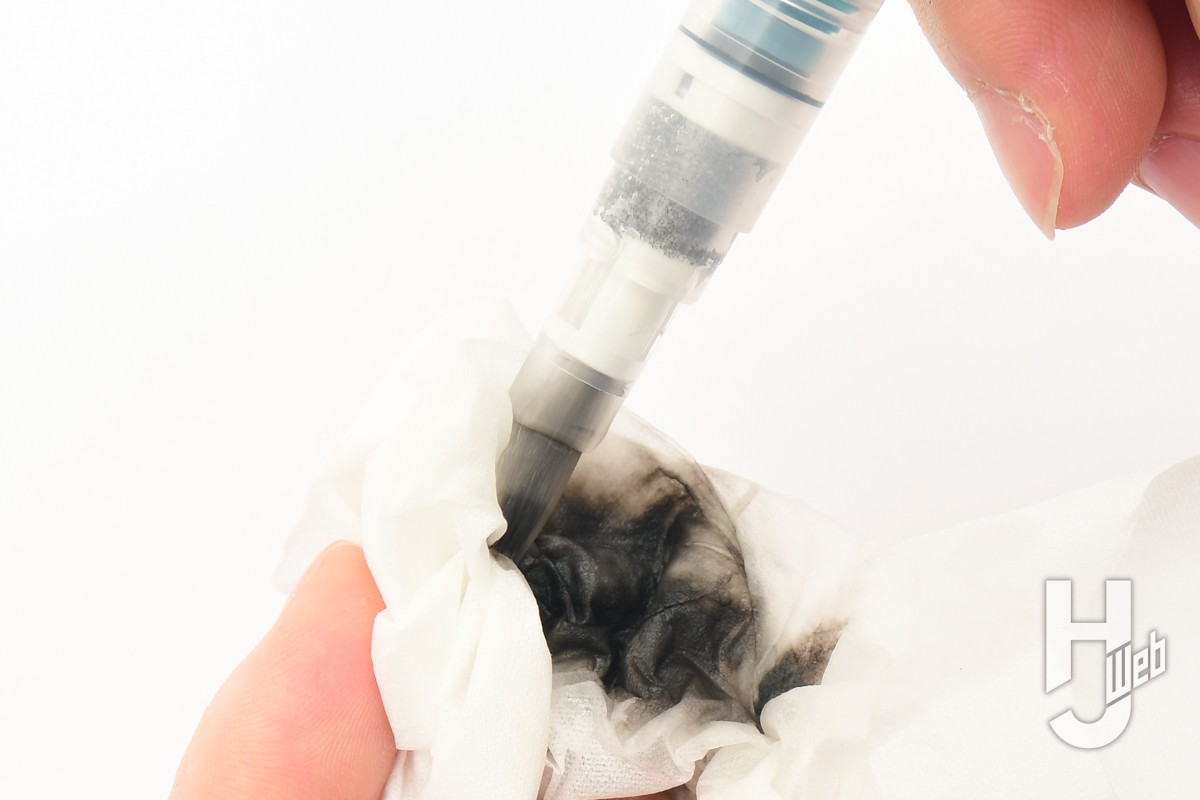 そこでブレンディングリキッドを入れてみて何度か筆の先端から出したところ、水で洗うよりも早く先端をキレイにすることができました。塗料を溶かしてグラデーションにさせるリキッドの力は流石ですね! このままブレンディングリキッドの筆にしても良さそうです。