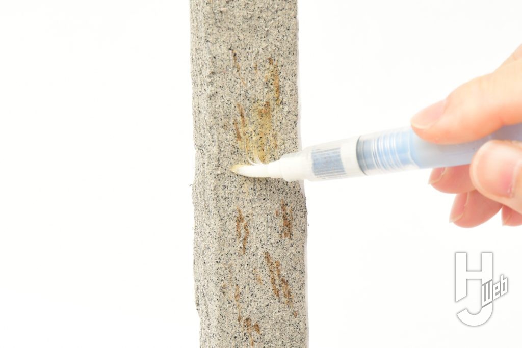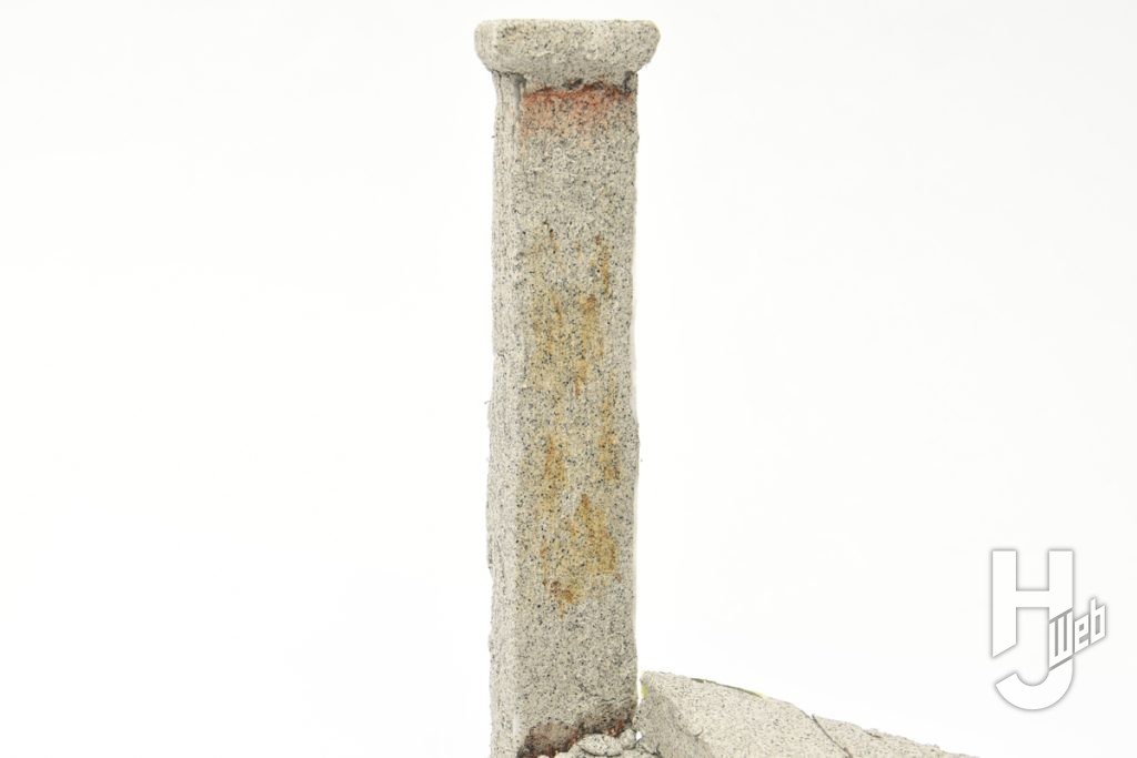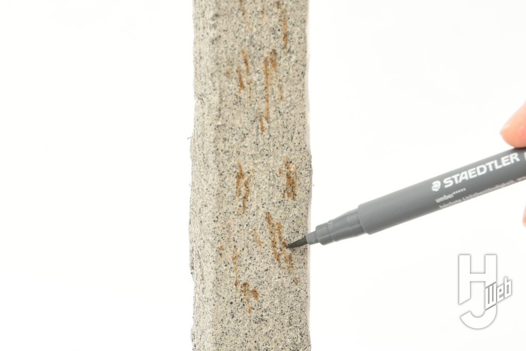 ▲ 上はブラウン、下はグレー、中心はアンバーで、柱のランダムな汚れをつけていきました。石の粘土単体でも柱感はありますが、ピグメントブラッシュペンで汚し、ブレンディングリキッドでぼかすことでさらに雰囲気を出すことができます