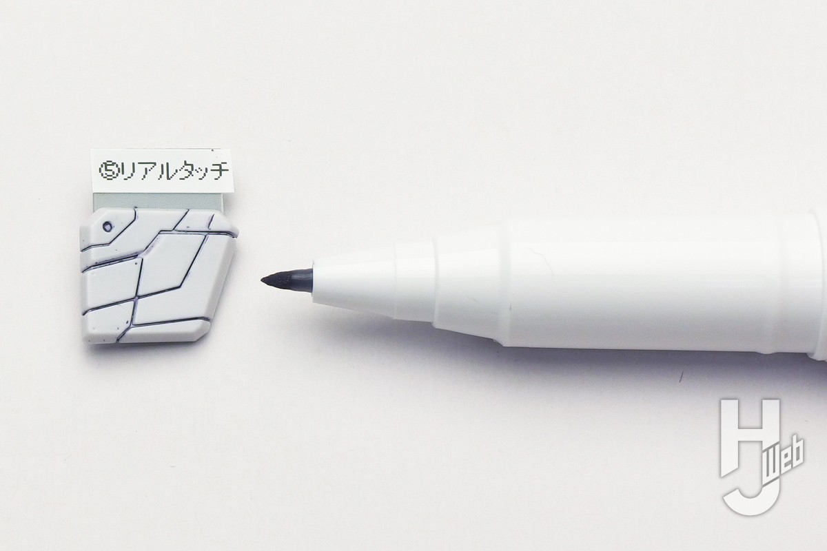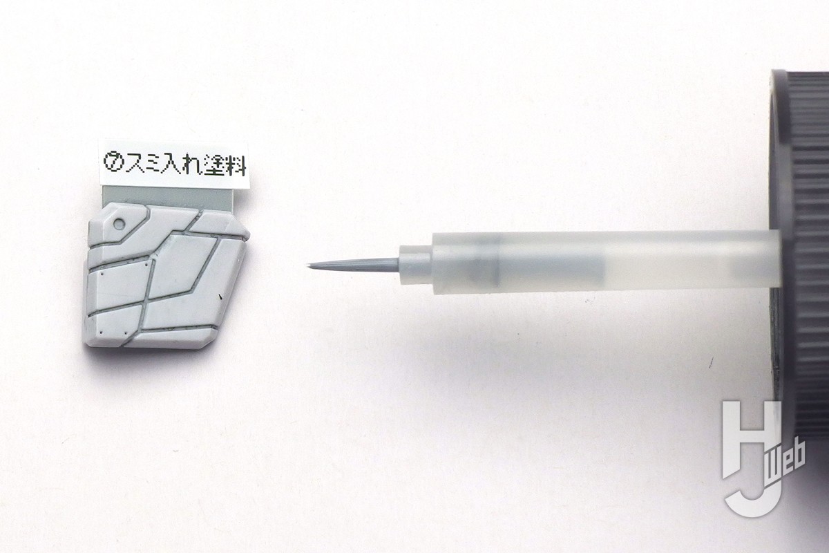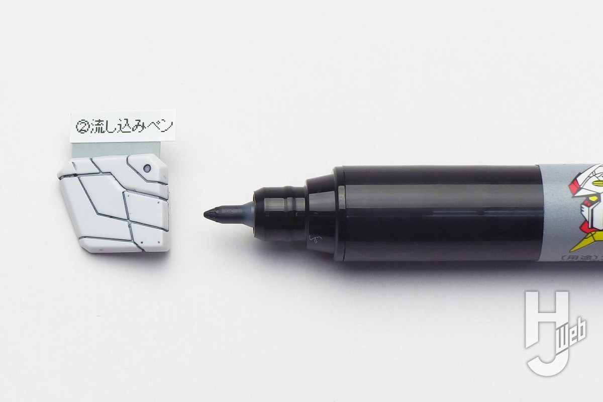 ▲ ②ガンダムマーカー流し込みスミ入れペン(GSIクレオス)。細く硬めのペン先で、凹みに触れるスーッとインクが流れていく作業のしやすさが特徴。下の塗装などを溶かしてしまうため「直接パーツに塗る」素組み専用となります