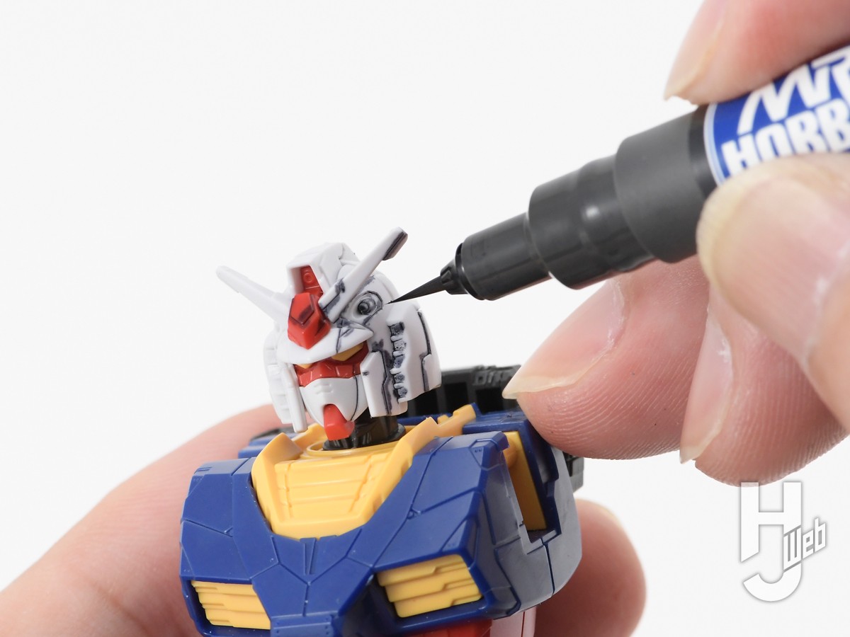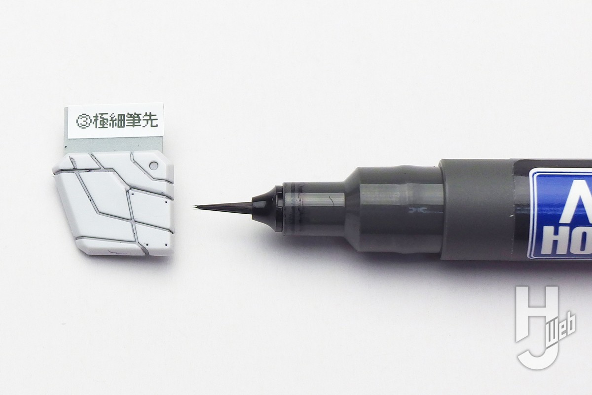 ▲ ①ガンダムマーカー スミ入れ用(GSIクレオス)。極細の油性ペンでクッキリ描けます。ミゾをなぞったところだけ描ける扱いやすさが特徴。ペン先を曲げないように注意!