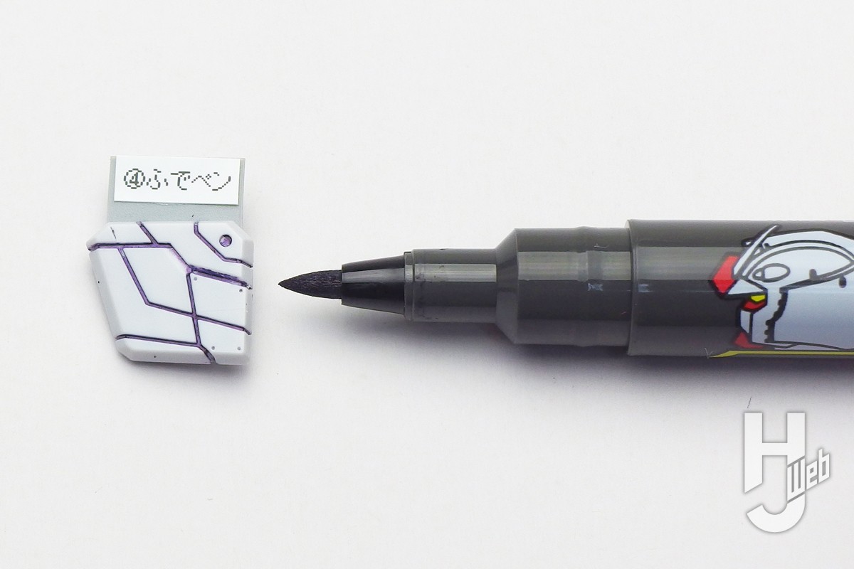 ▲ ④ガンダムマーカー スミ入れふでペン(GSIクレオス)。ミゾの内側までなぞりやすい筆ペンタイプ。水性のインクなので他の塗装の上にも使えます。ハミ出しは綿棒などで拭き取れます