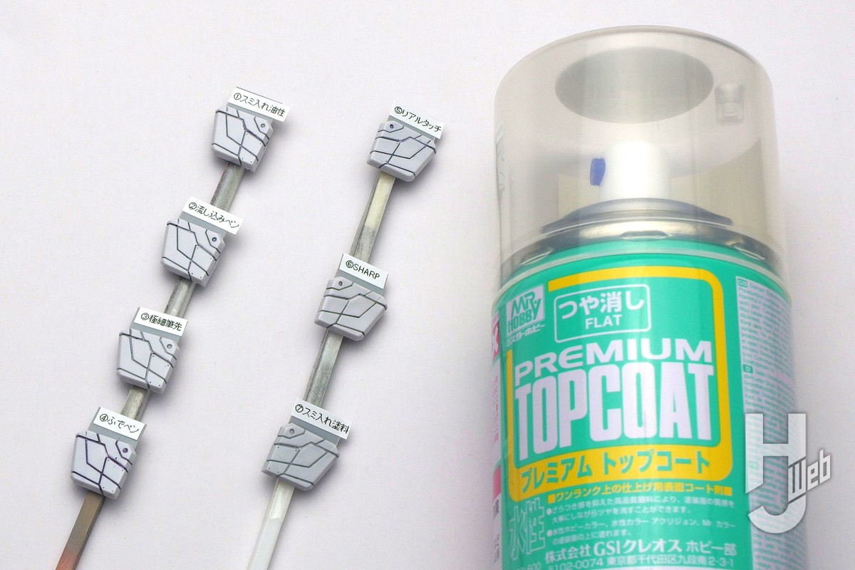 ▲ GSIクレオスのプレミアムトップコート つや消しを使用したクリアーコートによる表面の仕上がりを学べる回です。ヤスリなどを使用した表面処理との比較も確認できます