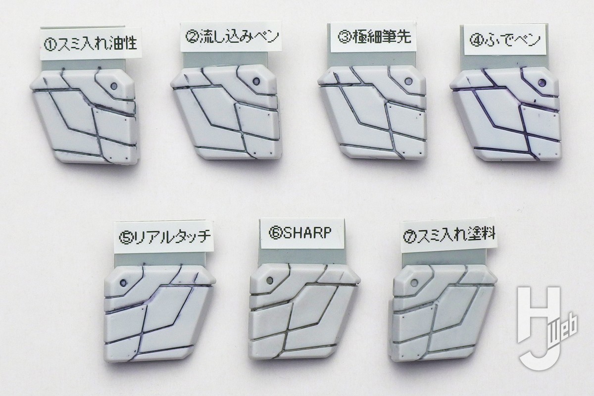 ▲ スミ入れに使う色による見映えの違いやパーツ色との組み合わせ、ランナーに付いたままのパーツへのスミ入れ方法など、効果的な方法を試しています