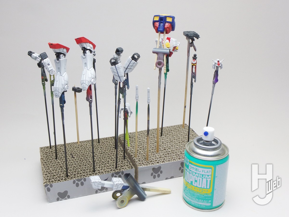 ▲ 各パーツごとに持ち手を付けて、缶スプレーでの塗装をしやすくしつつ、塗装後の乾燥もしやすいように準備をします