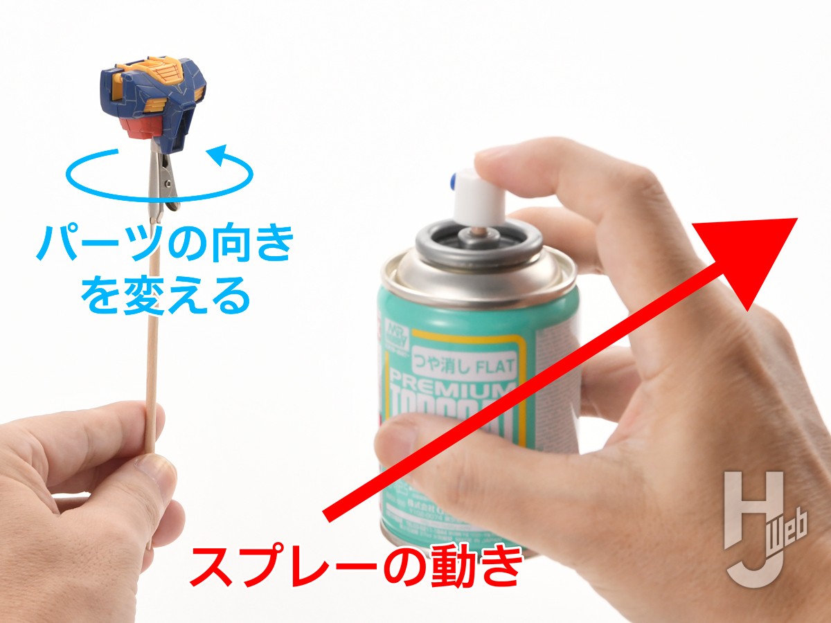 ▲ 缶スプレーは横移動させつつパーツに吹き付けます。パーツの片面に吹いたら向きを変えてから次の面を吹く、というように各面を塗っていきます。スプレーとの距離や横に動かす速さでパーツに吹く量を調整します。コツを掴むには、ランナータグに吹くなど練習してみましょう