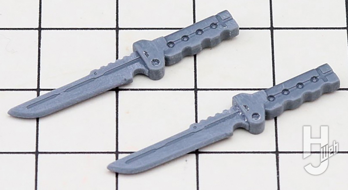 頭部ビーム機銃はピンバイスで開口し、首と胸部底面の肉抜きはプラ板とGSIクレオスのエポパPRO-Hで埋めました。サブエアインテークは彫り込んでシャープ化し、はめ込み式のフォールドクォーツは取り外しできるようピンバイスで底面に穴を開けています。各翼は翼端を削り込んでシャープ化しました。バトロイド形態時のミニガンポッドは砲口をピンバイスで開口。ファイター形態時のミニガンポッドは一体成型なので、周囲をスジボリ堂のBMCタガネで彫り込んで別パーツ感を出しています。砲口は0.8mmの真鍮パイプで作り直しました。太モモ中央の合わせ目はBMCタガネで段落ちモールド処理をして、各関節パーツなどの肉抜きはエポパPRO-Hで埋めました。