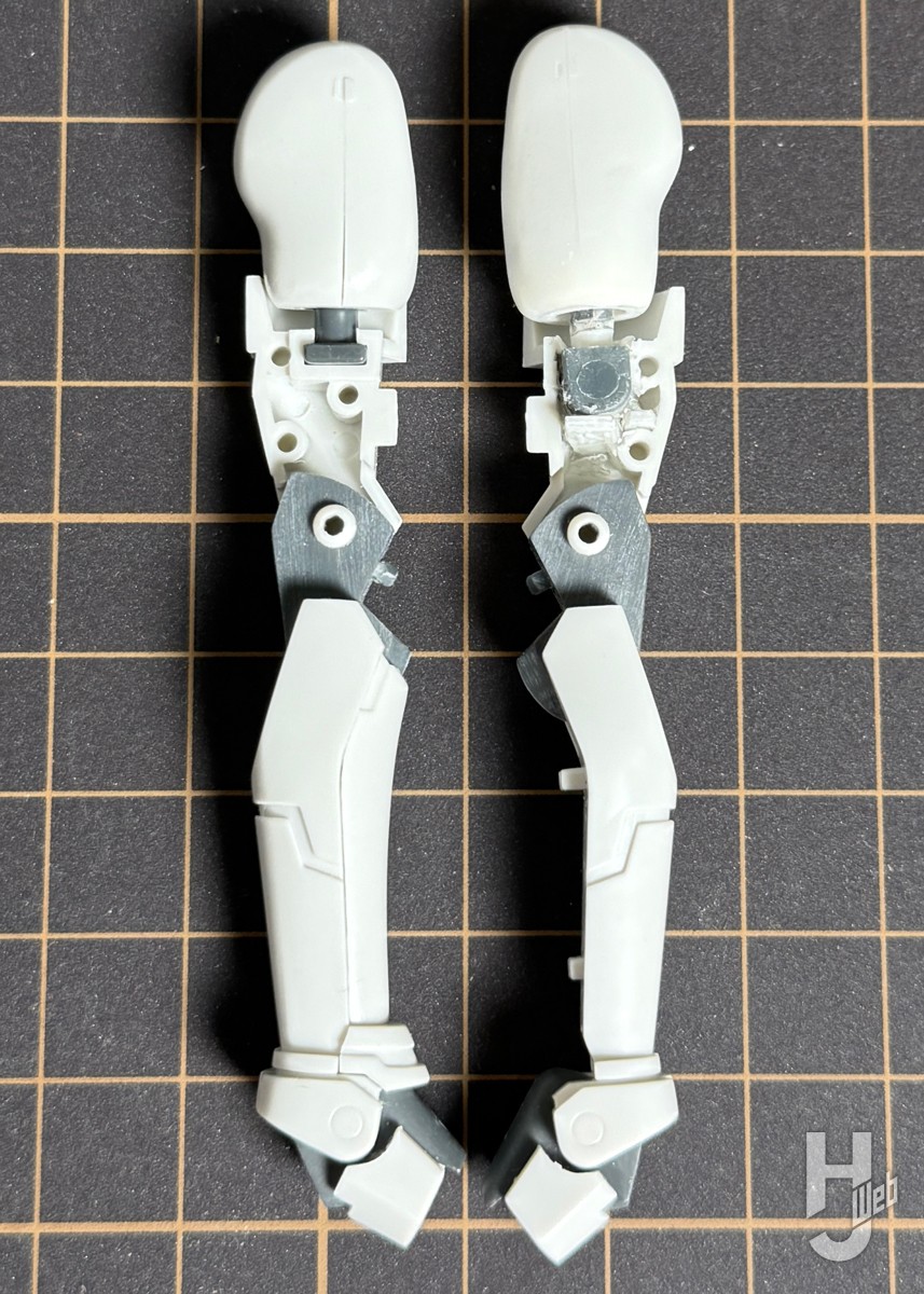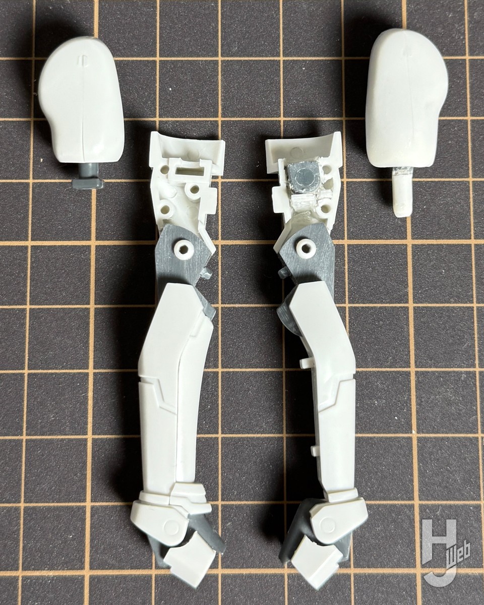 ▲ 脚は内部にポリキャップを仕込み、軸接続とし後ハメ加工をした。また太もも下部で2mm延長している