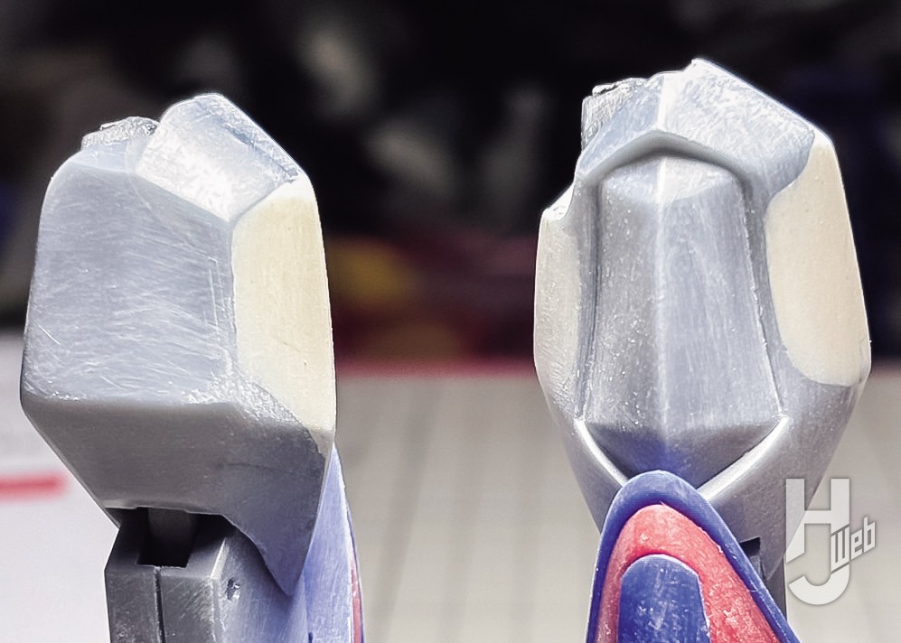 頭部はマッチョな胸部がかなり目立って頭部がちょっと小さく見えます。耳の部分を切り取り、1mmプラ板をはさんで再接着。耳を少し大きくしています。