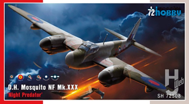 このところコンスタントに珍キットをリリースするチェコのスペシャルホビーから、モスキートの夜戦型Mk.XXXが登場した。実機は基本的には2段過給器を装備したマーリン72エンジンを搭載して高度性能の向上を図り、機首にアメリカ製レーダーAI Mk.Xを搭載し、英国本土とヨーロッパでの夜間戦闘に投入された。基本的には爆撃型に準じるが、レーダー装備のため機首の形状が大きく変化したのが特徴だ。すでに原型となったMk.XVIは エアフィックスの隠れた傑作キットが存在するが、型式が異なるしやはりイギリス機ファンには嬉しい存在となるだろう。木製機のため少ないが、パネルラインはスジ彫りで表現され、要所要所にはリベットも打たれている。他型式への発展を考慮して機首は別パーツとされ、フラップもダウン状態の再現が可能だ。またプロペラと燃料タンクも2種が用意されている。さらにコクピットなどのディテールもこのスケールでは水準を超えており、デカールはイギリスやベルギーなど6機分が用意されている。生産数が少ないことを考慮し、早めに入手しておいたほうが無難だろう。なお同社では、同時にオリジナルであるMk. XVIもリリースしており、エアフィックスと作り比べるのも楽しかろう。