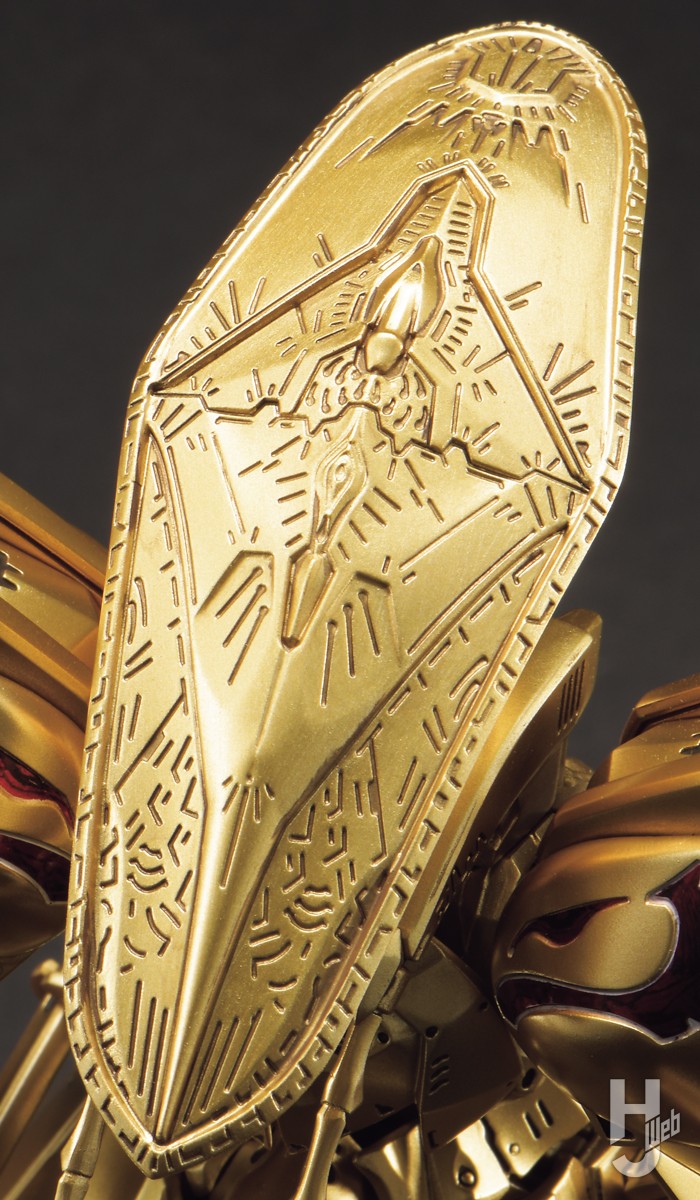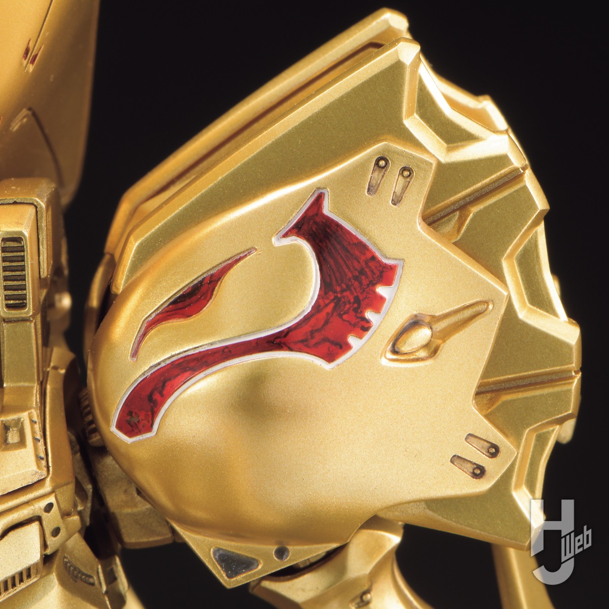 赤のラインは下地のゴールドを活かしてクリアーレッドでキャンディ塗装しています。その際、肩のラインにはレリーフのイラストをエナメル塗料で加筆してから、ちょっとひと工夫(小さすぎるのでそれっぽくですが)。