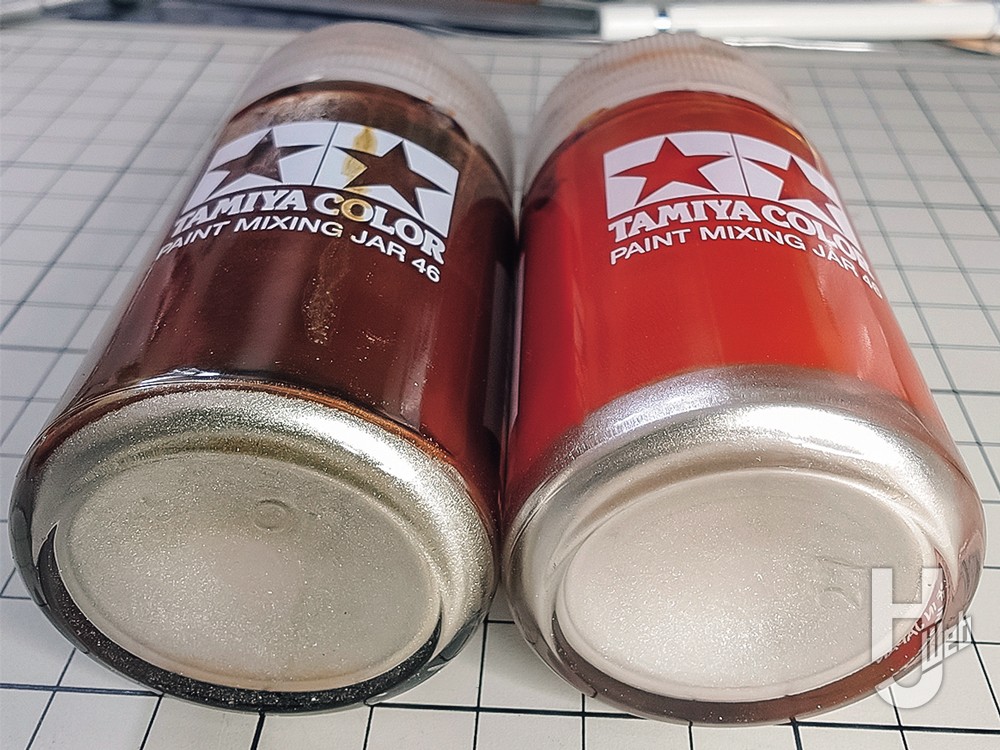 今回もいつも同様にガイアノーツのスターブライトゴールドの上澄みのクリアーオレンジを半分捨てて、捨てた分量だけ透明クリアーを足して色味の調整を行ったものを使用しています。色違いのフレーム部分も同じ方法で、さらにクリアーブラックを足すことでブラウンゴールドに寄せています。