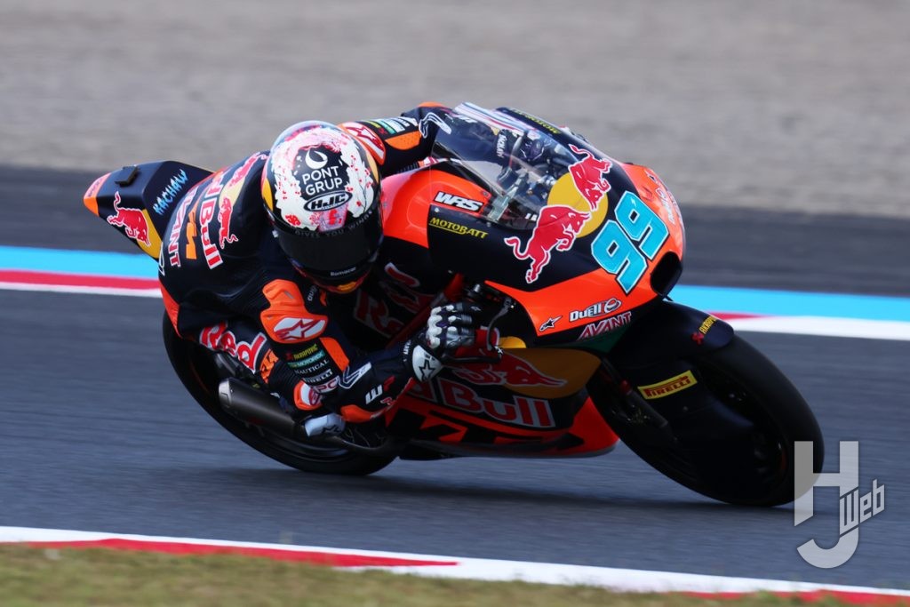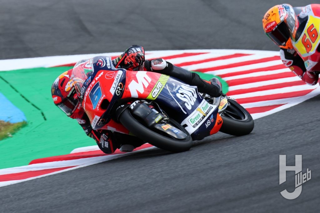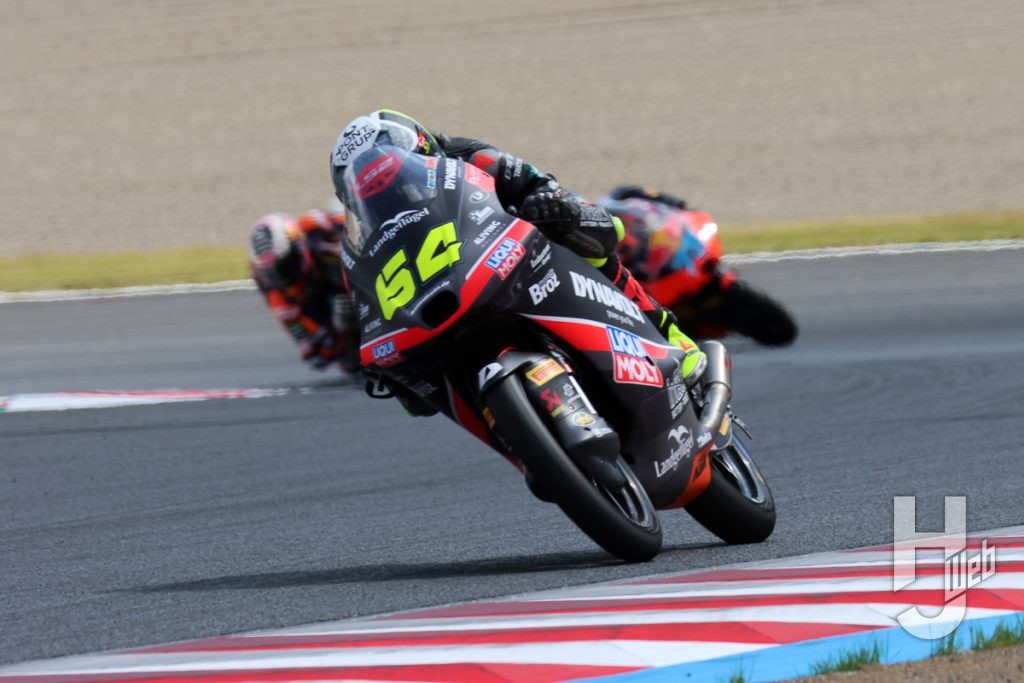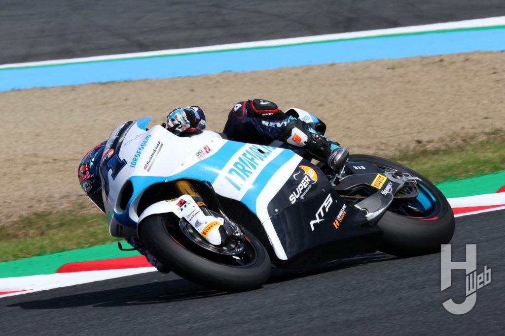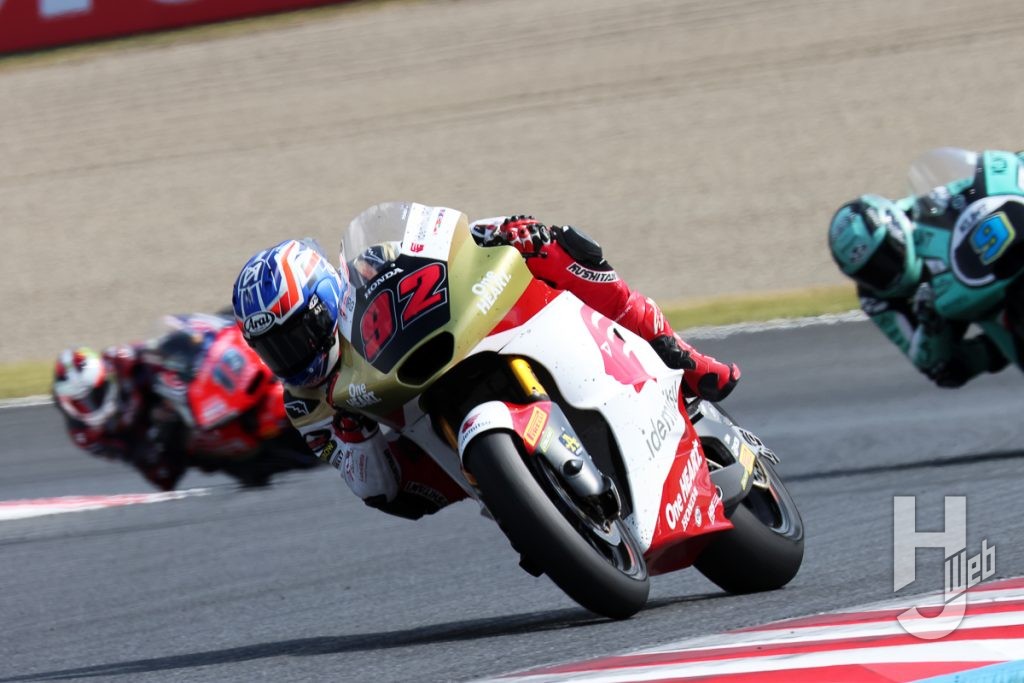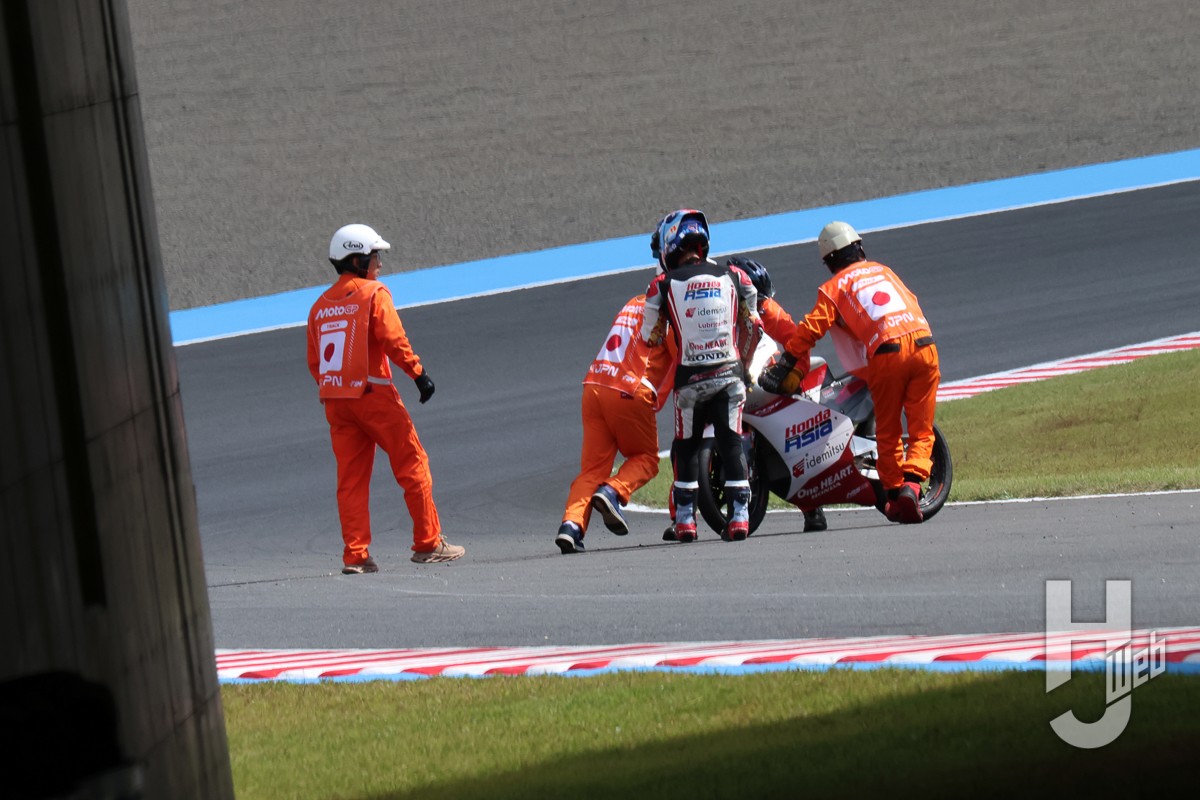 レース序盤は、予選5番手の#72古里太陽(Honda Team Asia)が2番手を走行し、#6山中琉聖(FRINSA-MT Helmets-MSI)もトップグループに食らいつく。だがレース中盤小雨が落ち始め、雨足が強くなったタイミングで2番手を走る古里が2コーナーで転倒してしまう。古里は再スタートを切るものの、5コーナーでサイドクラッシュし、レースをリタイヤした。