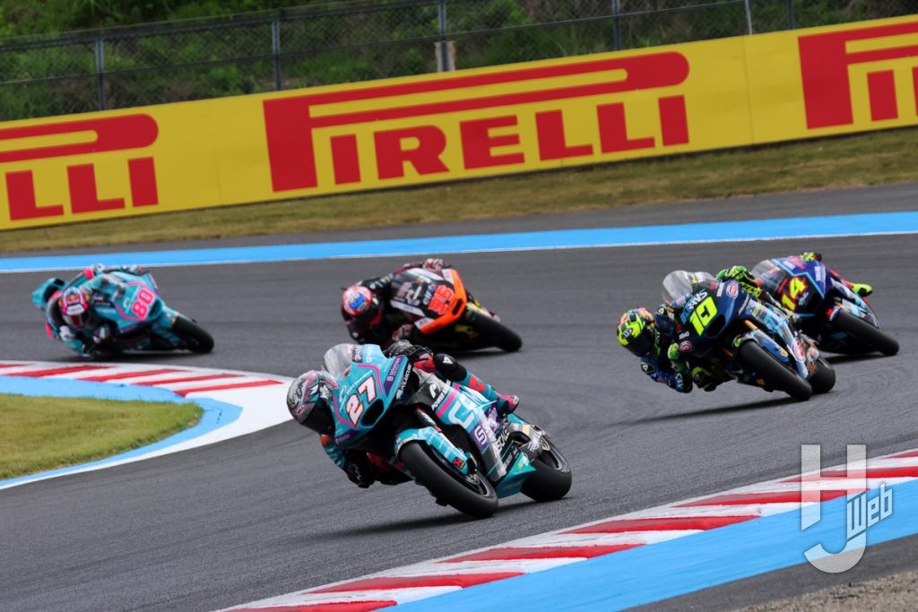 #71佐々木歩夢(Idrofoglia Racing GP)と國井勇輝(Idemitsu Honda TeamAsia)の2名の日本人ライダーが参戦するMoto2™クラス。ホールショットを奪ったのは予選2番手のダニエル・オルガド(CFMOTO Power Electronics Asper Team)。序盤の混戦をいちはやく抜けたオルガドは2周目にトップに立つと、2番手の#10ディエゴ・モレイラ(Italtrans Racing Team)を徐々に引き離していく。予選8番手の佐々木はスタートでポジションを大きく落として追い上げの展開に。