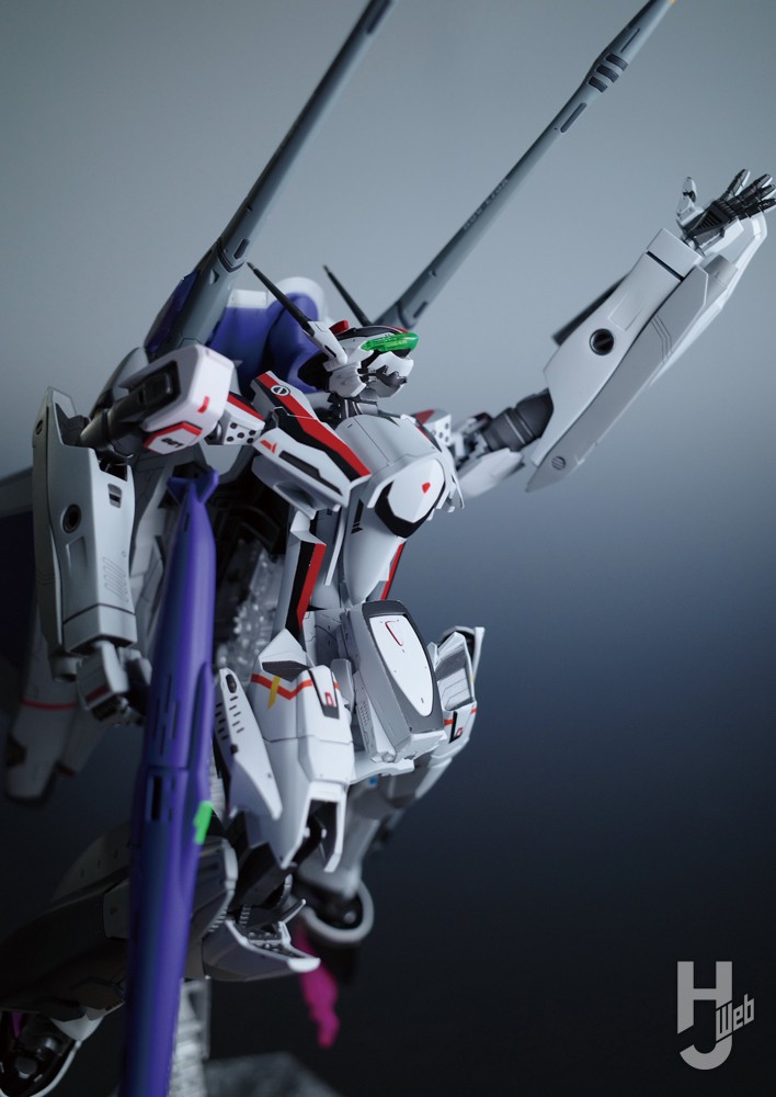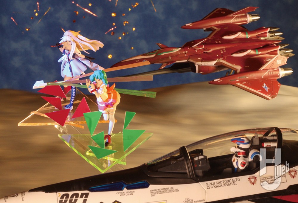 1/20の機首コレと1/72の三段変形キットを使用し、スケールの違いを活かして奥行きを表現。宇宙背景を描いた布はピントがボケるように遠くに設置し、地面を表現した布を手で引っ張ってスピード感を出し、ランカ、シェリル、VF-27はアングルの調整で浮いているように見せていたりと、撮影のための工夫が随所に盛り込まれています。