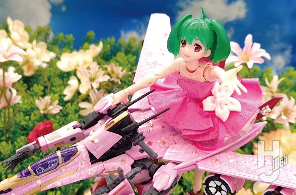V.F.G.ランカのマクロス40周年記念モデルを使用して、可愛さに全振りした作品です。桜をモチーフにしたハンドメイド衣装がお見事で、腰の大きな花飾りがアクセントになっています。それに合わせてVF-25に施された桜と格子模様にもセンスを感じます。花の背景がランカの可愛さをさらに引き立てています。