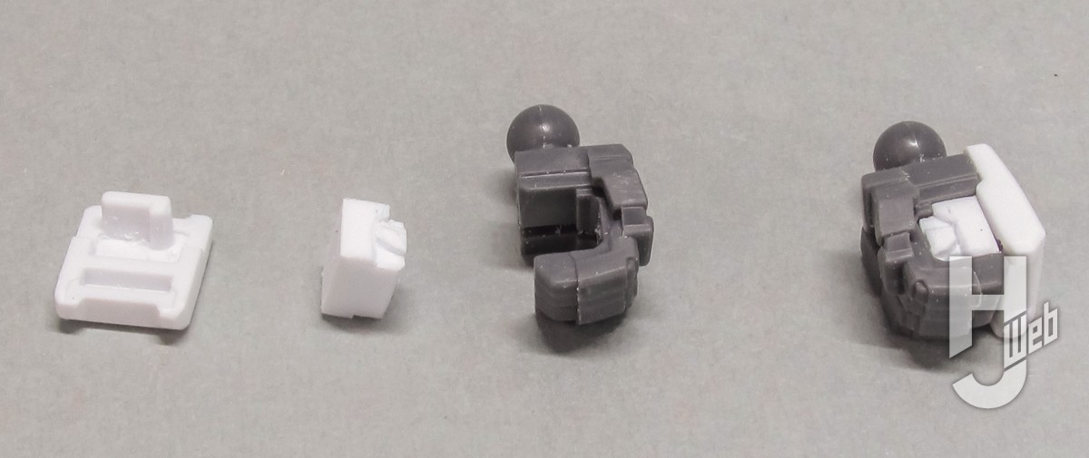 ▲ 前腕アーマーは裏側の肉抜きをエポパテで埋めてフラットに整形。外側のマウント穴はプラペーパーをポンチで切り抜いたものを塗装して底面に貼り付けた