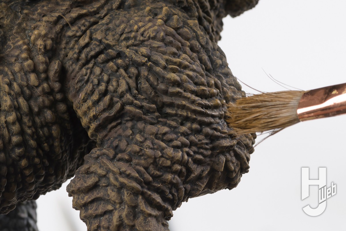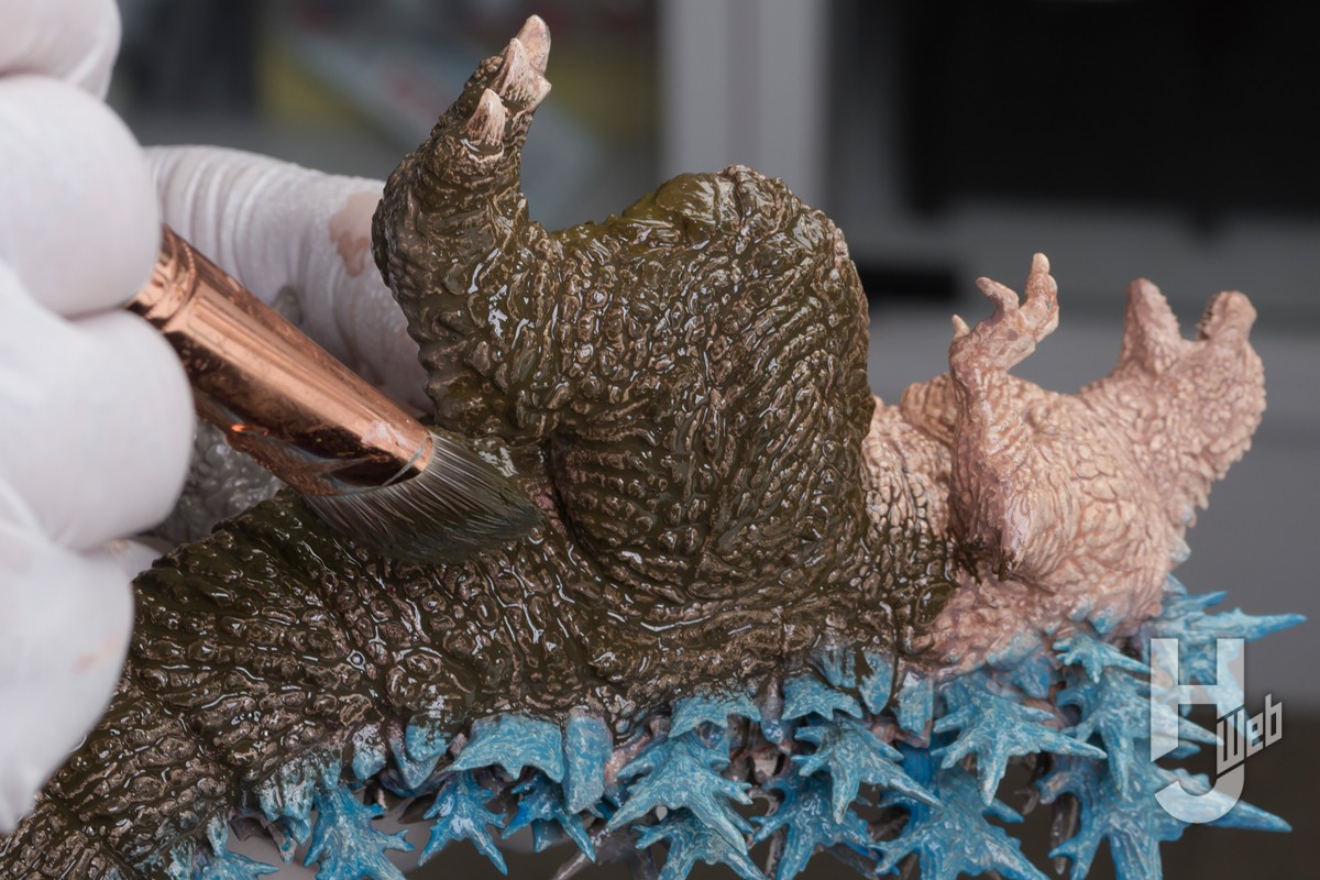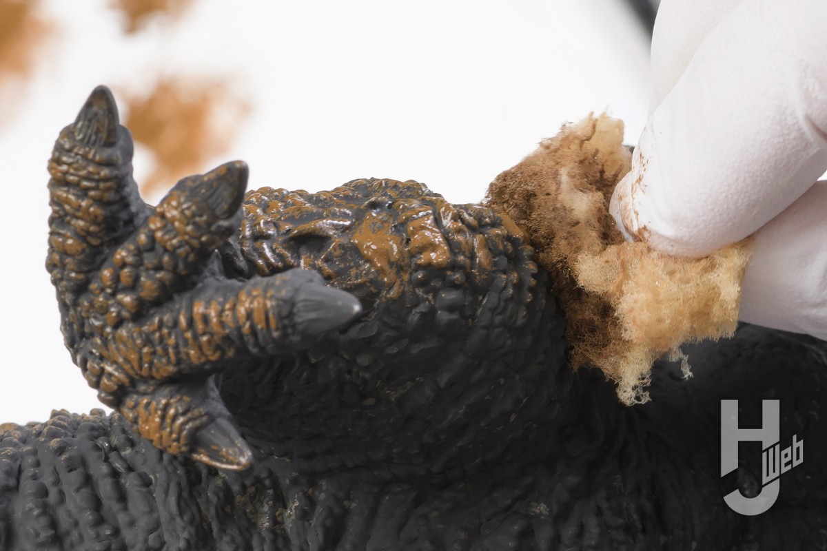 ▲こちらのゴジラ本体を左右に分け、それぞれウォッシングとドライブラシの技法で塗装していく