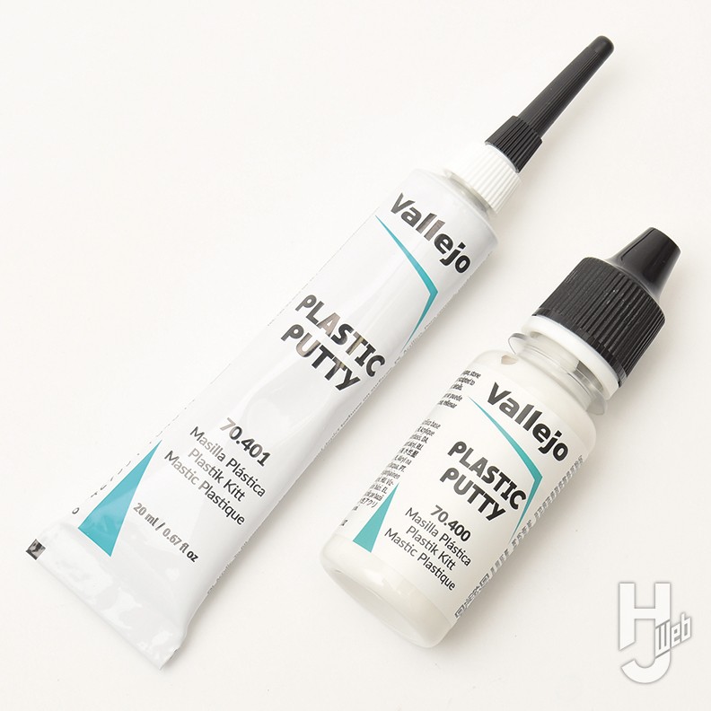 ▲パテは中身は同じで容器別に2タイプ。中身の量とノズルの違いに差があり、チューブタイプはノズルが細長く狙いやすく、中身も出しやすいのが利点。おなじみ塗料容器は使い方は変わりないですが、容器が同じなので収納、持ち運びができるのが良いですね