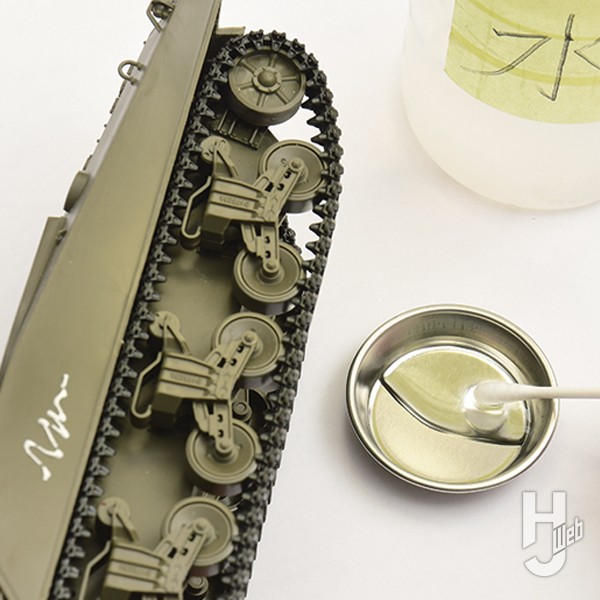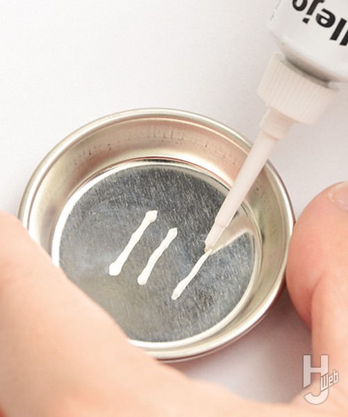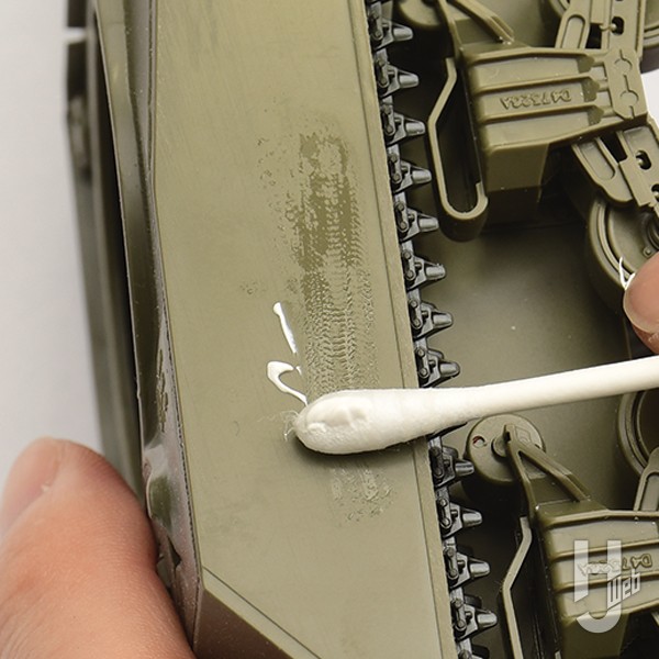 ▲“水溶性”であることの特徴を見ていきましょう。パテは盛り付けたあと、乾燥前なら水をつけた綿棒などで拭うことができます。水に溶ける性質のため、驚くほどキレイに拭えます