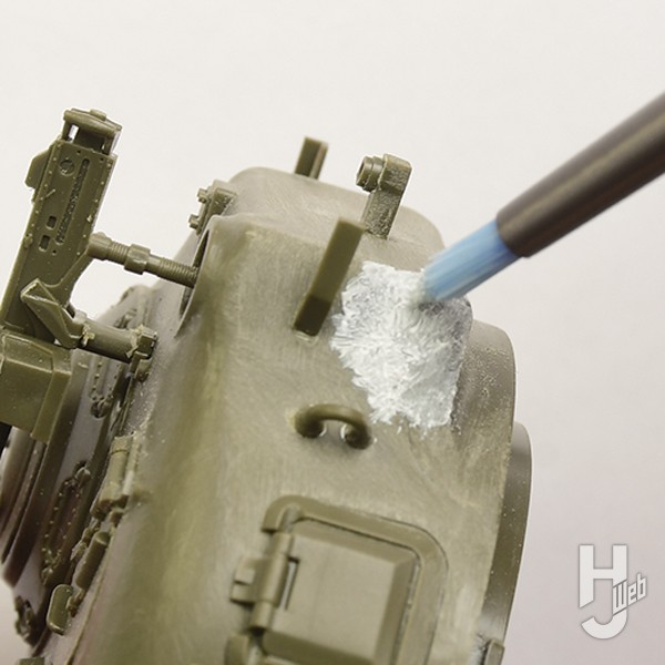 ▲パテを軟化させることも可能でパーツ表面にパテを盛りつけた後、水を含んだ筆で叩くとパテを薄く広げつつ、表面にテクスチャも付けることができます