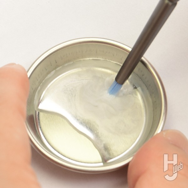 ▲水で溶けるということは、ツールの洗浄も水でできます。パテを筆で塗布すると、洗浄が大変でそのまま使い捨ててしまうなんてこともあるので、簡単にパテを落とすことができるのはうれしいですね