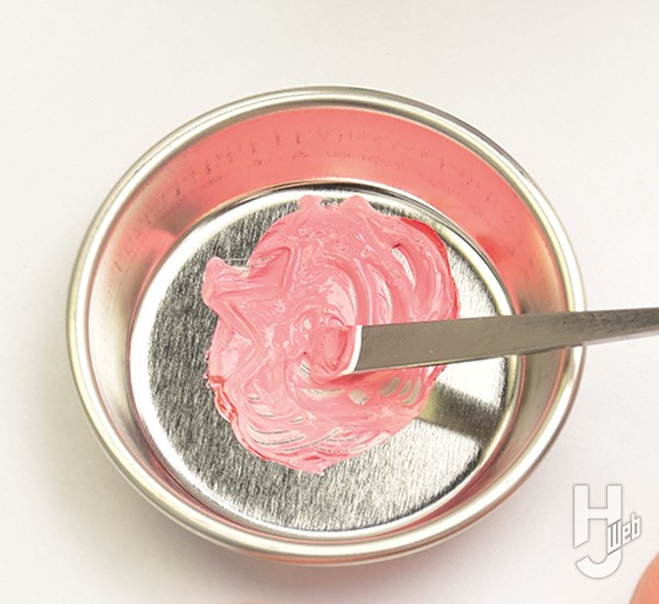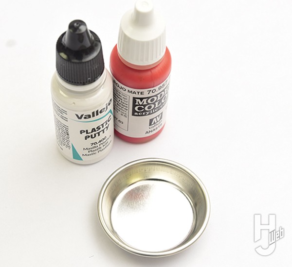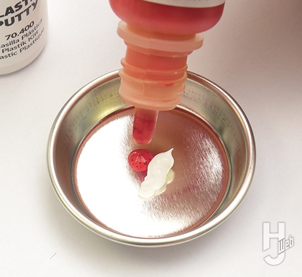 ▲ファレホのパテならではの性質として、ファレホ塗料で着色ができます。パテ自体は白いので、赤を混ぜるとピンク色に変化します