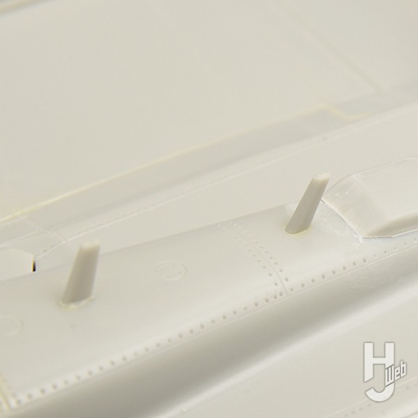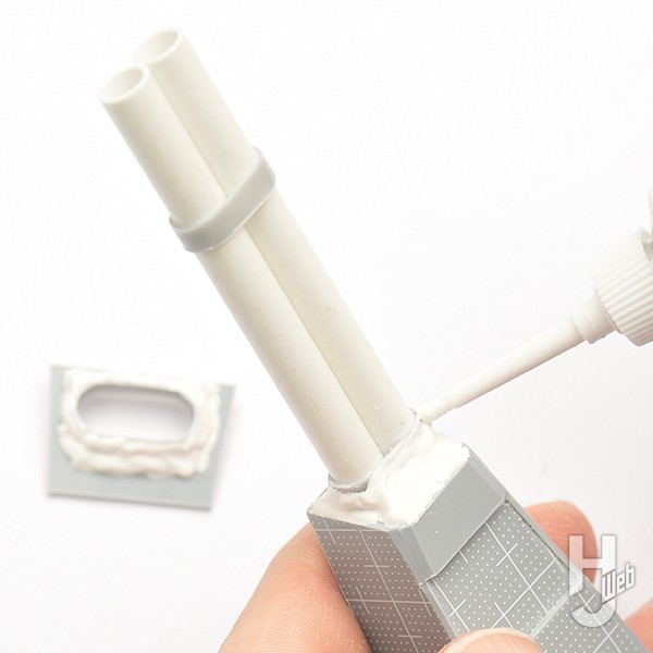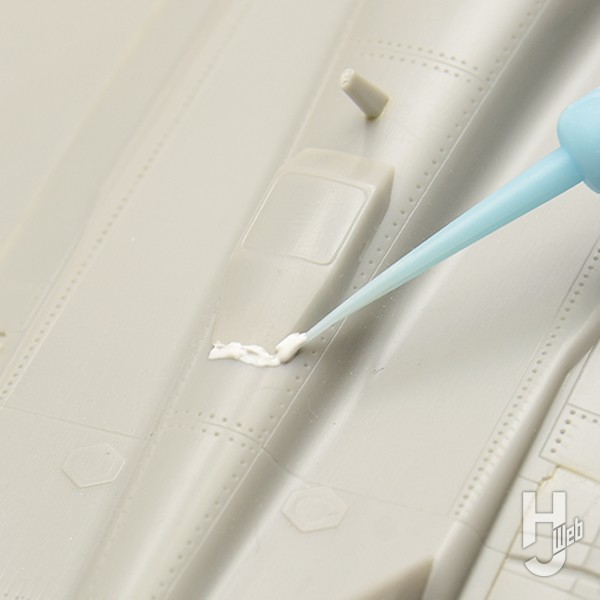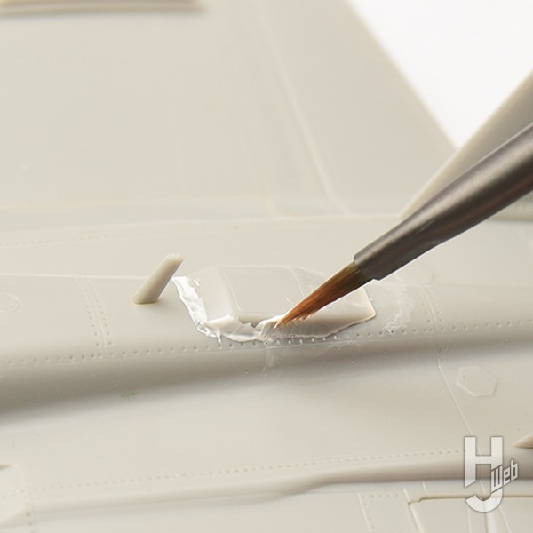 ▲接着したパーツとの間に少し隙間がある……というときも、このパテの出番。隙間にパテを詰めてから水を付けた筆で余分をはらっていきましょう。キレイに拭えるためパネルラインやリベット等のディテールを潰してしまうこともありません。航空機ならキャノピーと機首の隙間にも役立ちそうです
