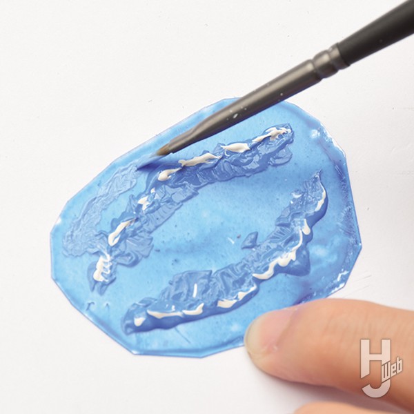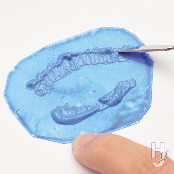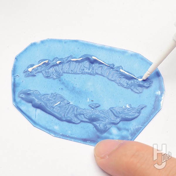▲まずは青を混ぜたパテで、青い波を盛り付け。塗布後に筆を用いて内側は伸ばし、外側は高めに表情をつけて波の流れを作ります