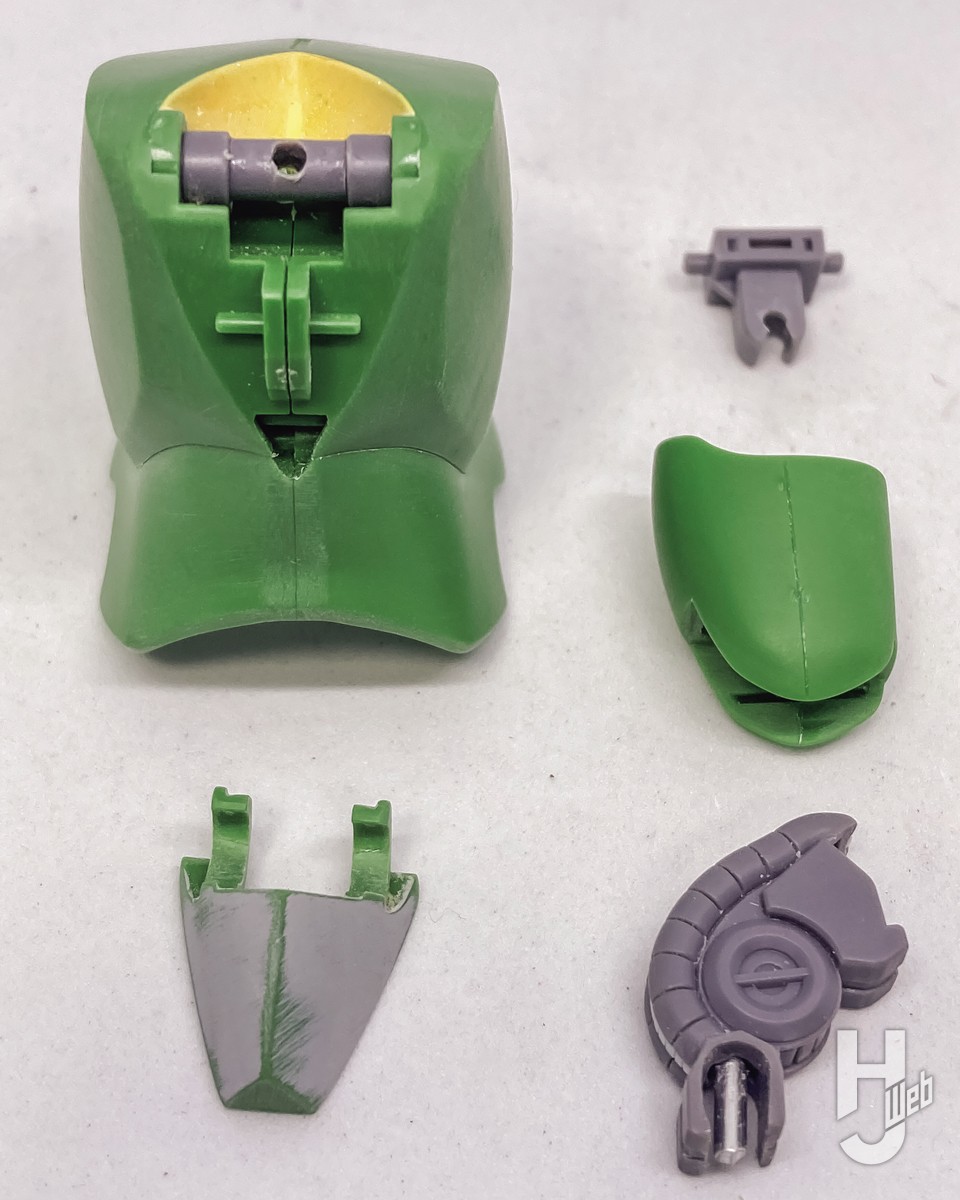 若干左右に動くモノアイパーツは正面用があるのですが、設定画に見られる左ズレ用のパーツも準備されているので、各々2.5mm径で開口し、ウェーブのH・アイズを取り付け、交換可能としました。首のパーツは裏の肉抜き穴を埋め、本体との取り付け軸をいったん切り離し後ハメ加工しました。