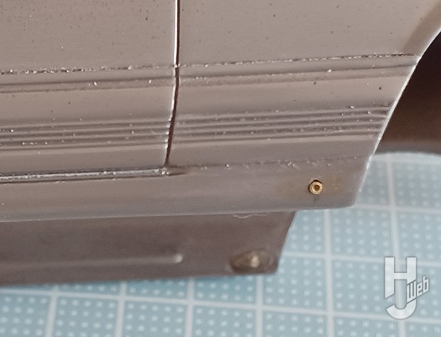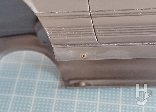 エンジンにも関連するのですが、エンジン&ミッションがモナカ割構造ですので合わせ目は消しています。リアロアアームの材質がジュラルミンだった記憶がありますので、ガイアノーツのスターブライトジュラルミンで塗装してます。また、細かい部分ですが、サイドシェル部の車載ジャッキアップポイントを真鍮パイプを使い4ヵ所再現しています。