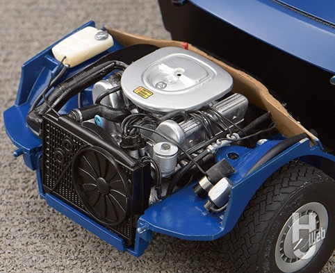 ▲ボンネットを外すとV型8気筒エンジンが現れる。キット自体ラジエーター、エアクリーナー、バッテリーなど、補器類も再現されており見ごたえがあるが、作例では、パイピングの追加や一体化されているラジエーターリザーブタンクやイグニッションコイルを別パーツ化するなど、さらなるディテールアップが施されている