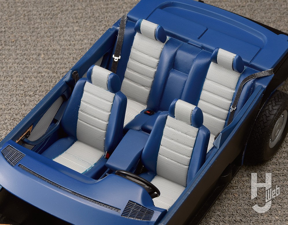 記憶の中の車両はホワイトのレザーシートでしたが、シート柄がデカールで用意されてますのでブルー系のベロアシート仕上げです。デカールを貼る前にデカール部分をガイアノーツのニュートラルグレーIIで塗装しておく凸凹部分でデカールが切れても目立ちにくくなると思います。乗車定員は4名なので4名分のシートベルトを用意しましたがベンツの金具は特殊形状ゆえに今回は汎用金具を使用しています。フロントシートベルトにはシートに着座しドアを閉めるとベルトガイドが自動作動し装着補助をする機能がありますので再現にチャレンジしてみるのもいいでしょう。