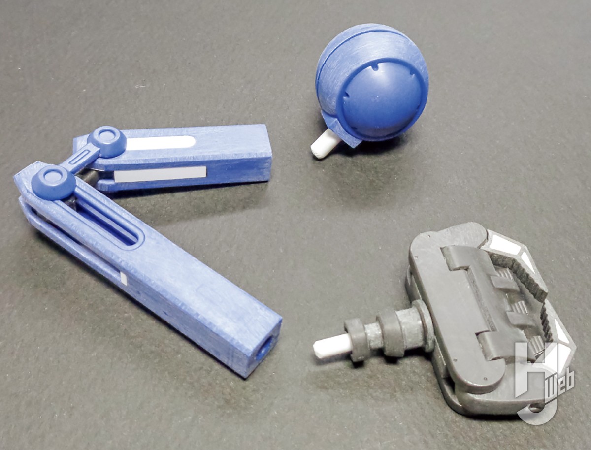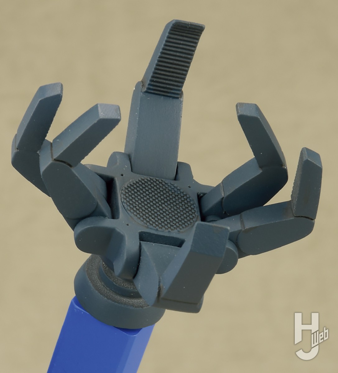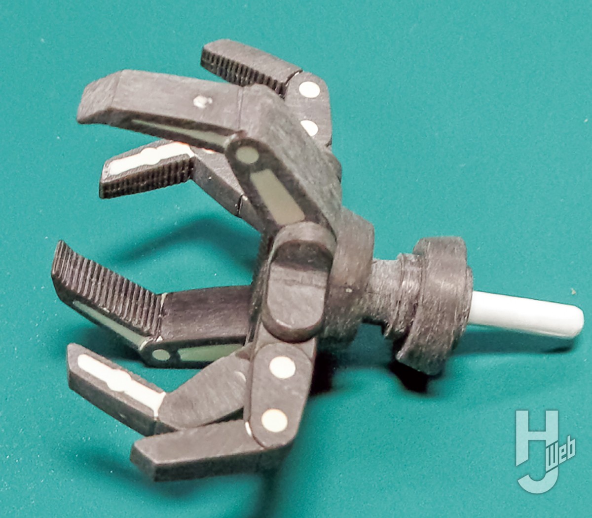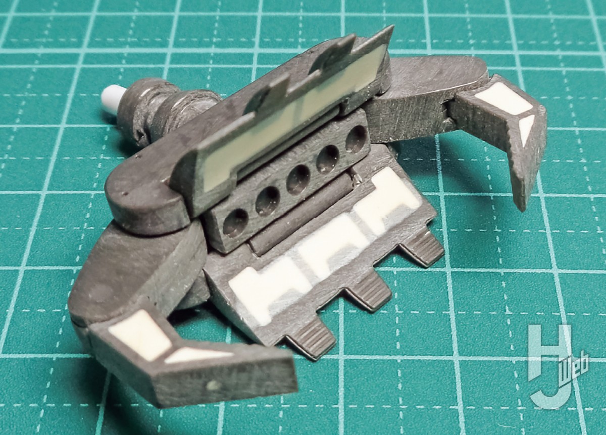 キットは肩と上腕が左右とも同じ形状だが、作例は設定画に合わせて右腕の形状を調整。上腕のロール機構と手首関節は後ハメ化を兼ねてポリキャップを内蔵させた。右腕のロケットランチャーは肉抜きを埋め、弾頭を追加し、可動部の塗膜が剥がれないように加工。左マニピュレーターは肉抜きを埋め、2本がつながっているツメを分割し、根元に真鍮線を入れて1本ずつ動かせるようにした。ヒジ関節はキットの機構をそのまま活かしたが、「ヒジとヒザの軟質樹脂部品は経年劣化で使えない可能性があります。その場合は、可動範囲が狭くなりますが適当な関節を移植するか、固定しましょう」とのこと。