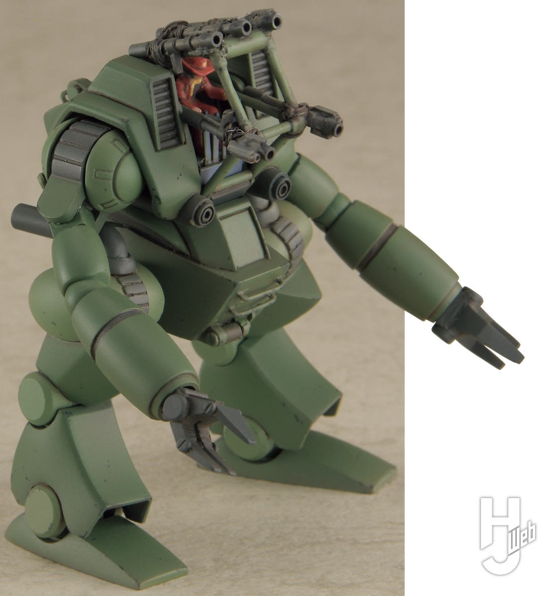 「ブラッカリィと並べたいWM」と言えばこの機体。スーパーミニプラで製作した。コクピット周りのフレームは1/144キットのものを流用してシャープ化し、真鍮パイプ製のキュサ81mmロケットランチャーをほぐしたリード線で固定した。胴体は肩の後ハメに分割位置を変更。各部の甘めのモールドやステップ類は市販パーツと金属線に置き換えた。上腕には横ロール機構を追加。正装のファットマンはMGキットに付属の適当なフィギュアを加工。帽子やマフラーは保湿ティッシュを瞬着で固めて形作った。